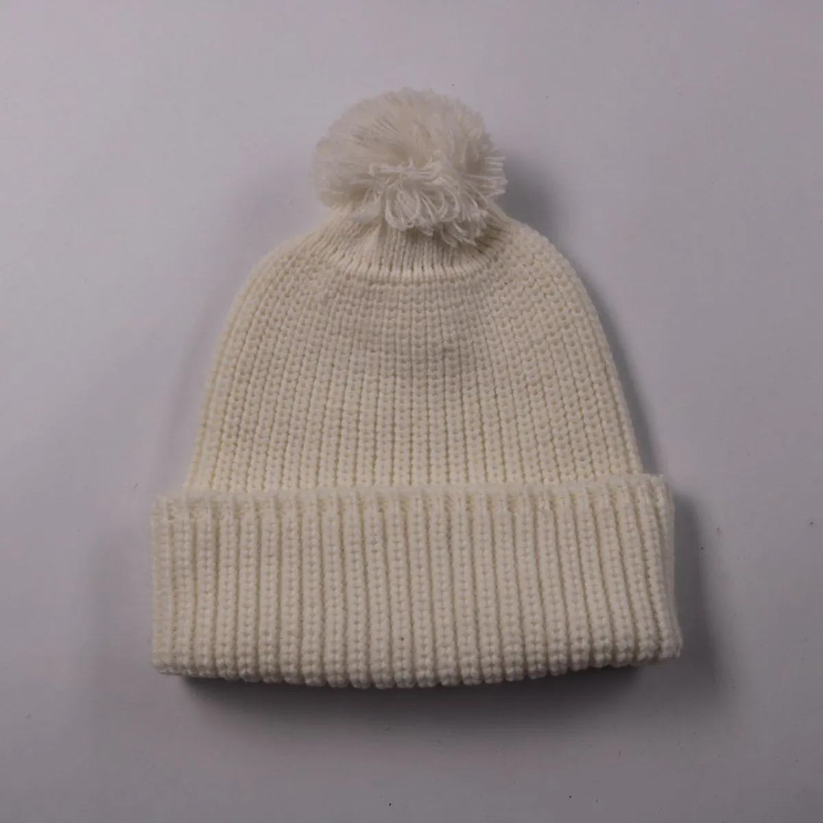 Вязаная шапка-бини с помпоном, без видимого бренда. Подойдёт для зимних прогулок и поездок, хорошо сочетается с пуховиком и пальто. Плотная резинка по низу помогает шапке лучше держаться и закрывать уши от ветра.