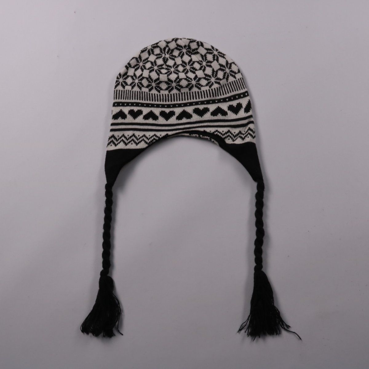Вязаная зимняя шапка-ушанка с жаккардовым черно-белым узором и длинными завязками с кисточками. Подойдет для прогулок и повседневной носки в холодную погоду. Внутри мягкая флисовая подкладка, хорошо сохраняет тепло и прикрывает уши.