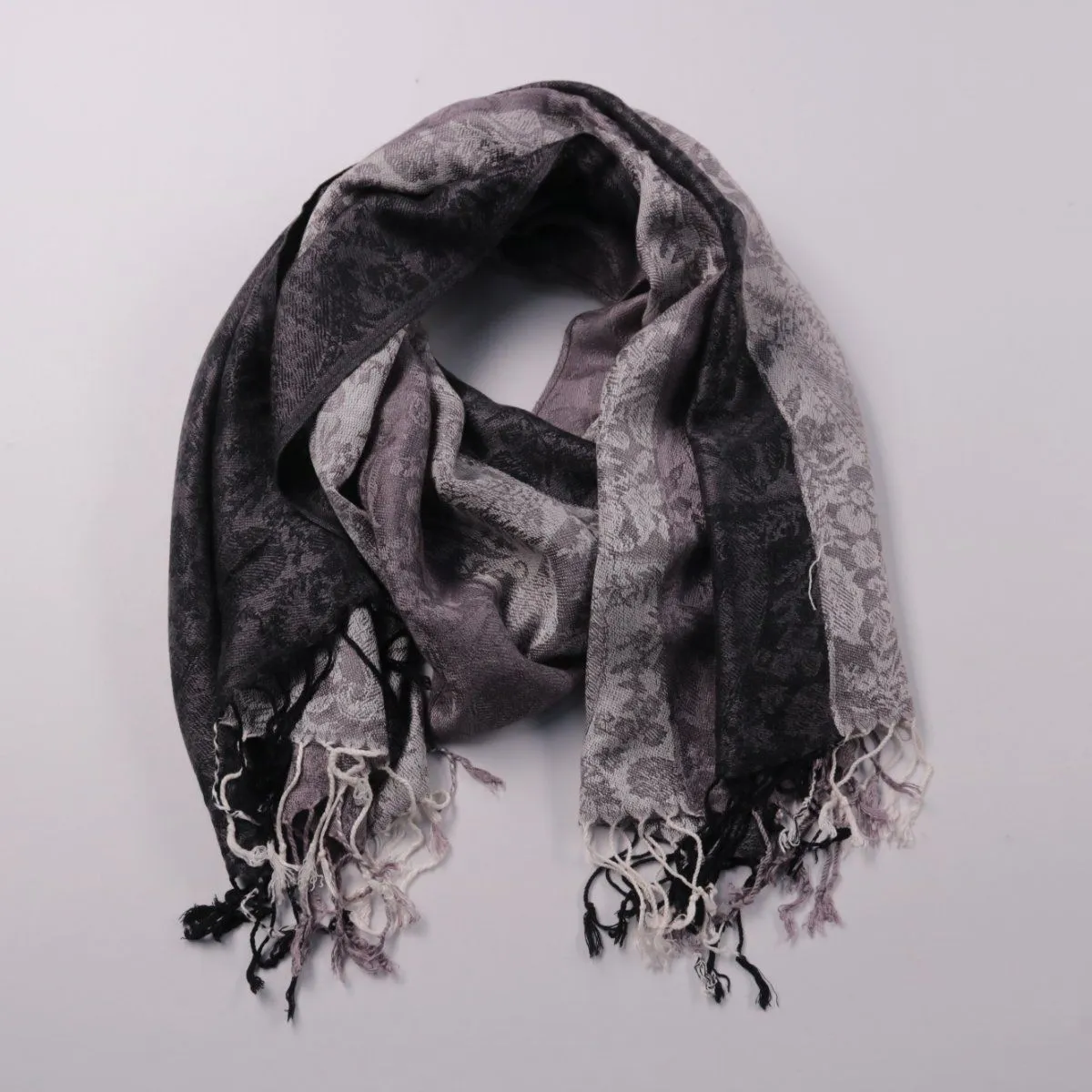 Шарф-палантин в серо-чёрной гамме с жаккардовым узором и кисточками по краю. Подойдёт для повседневных образов и в качестве лёгкого утепления в прохладную погоду. Удобно драпируется и добавляет фактуру даже к базовой верхней одежде.