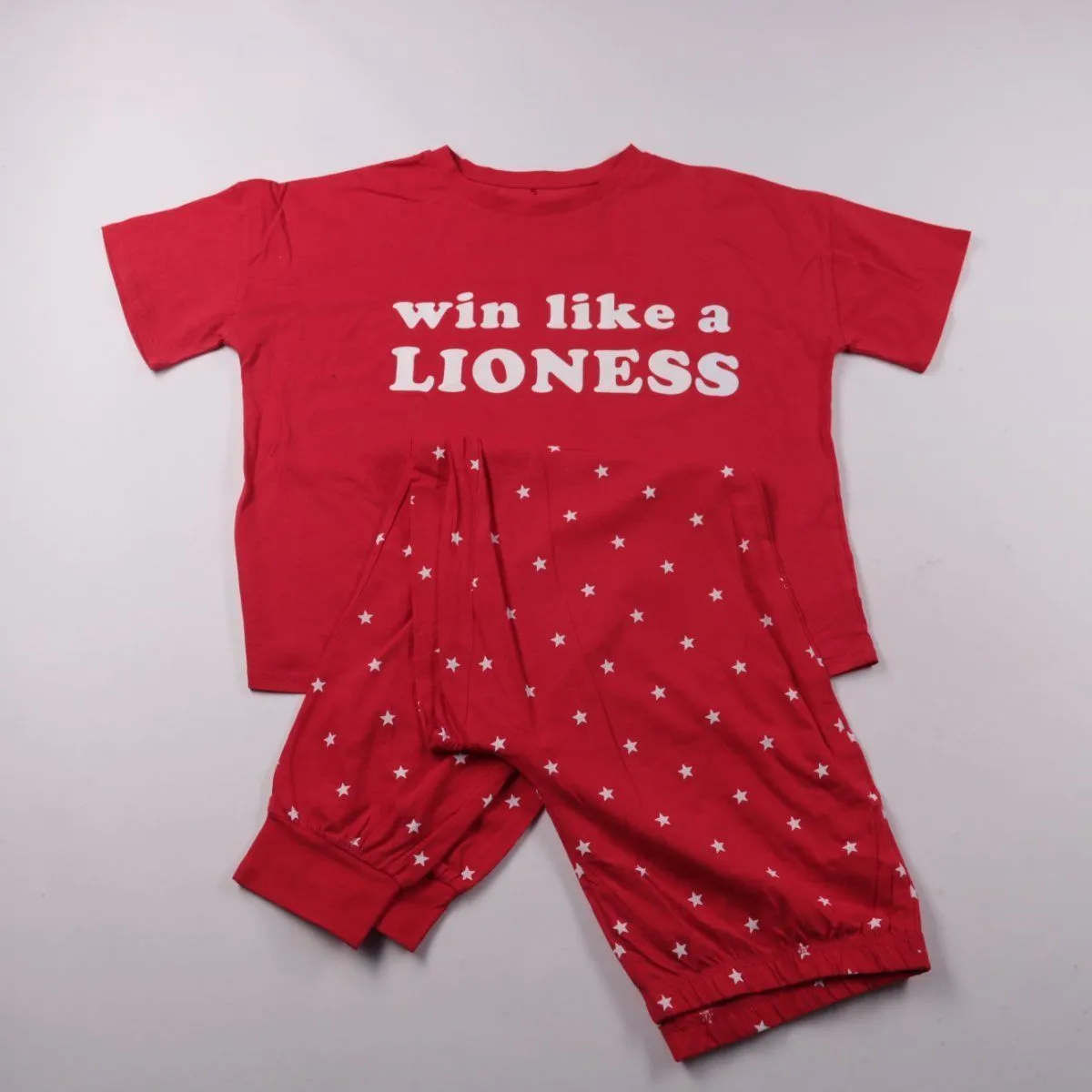 Пижама George из хлопка: футболка с коротким рукавом и надписью, брюки с принтом в звёздочку. Подойдёт для сна и домашнего отдыха в любое время года. Манжеты на брюках помогают штанинам держаться на месте.