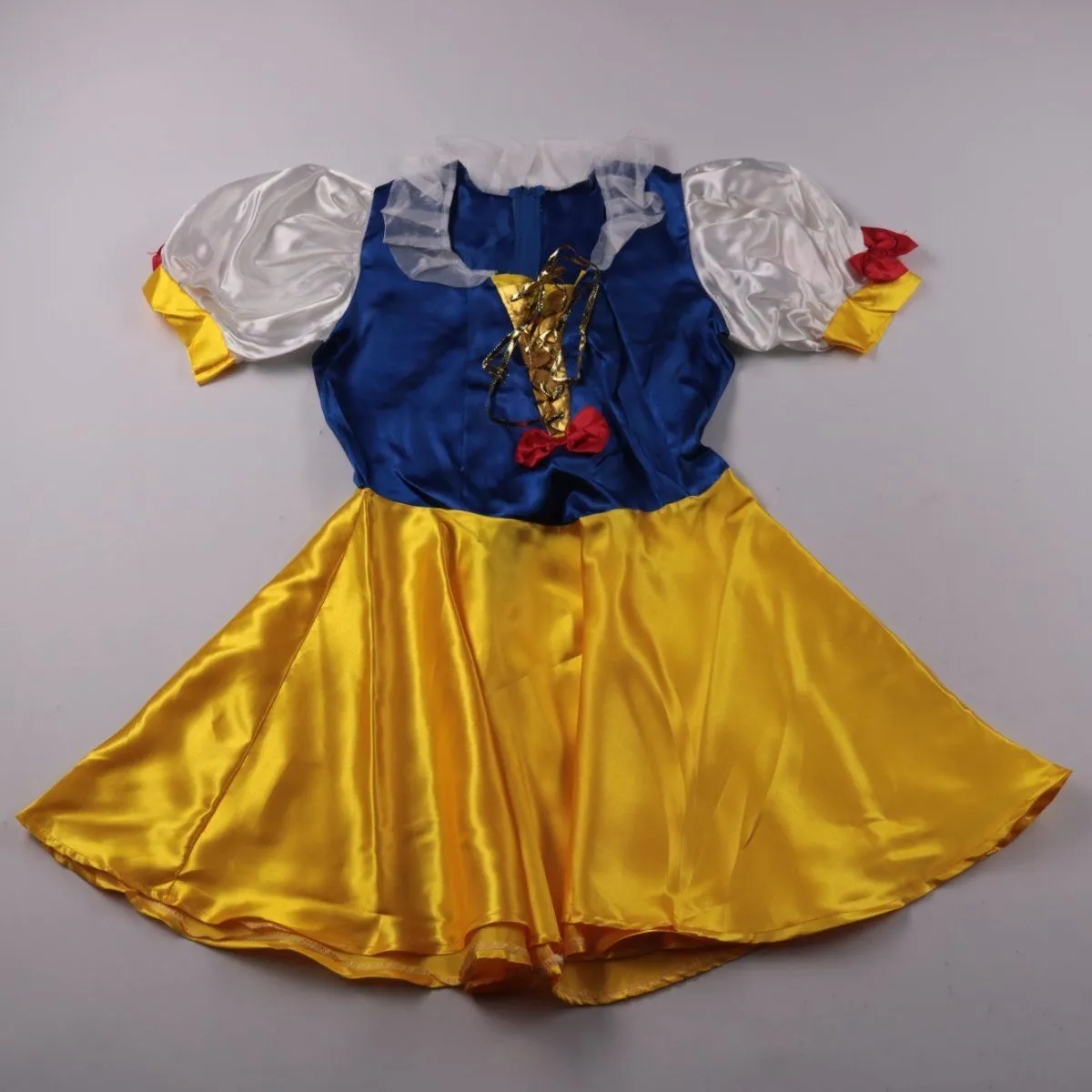 Карнавальное платье для девочки в стиле «Белоснежка»: синий лиф, жёлтая юбка и белые рукава-фонарики с красными акцентами. Подойдёт для утренников, праздников и тематических фотосессий. Ткань с атласным блеском хорошо смотрится на фото и легко гладится.