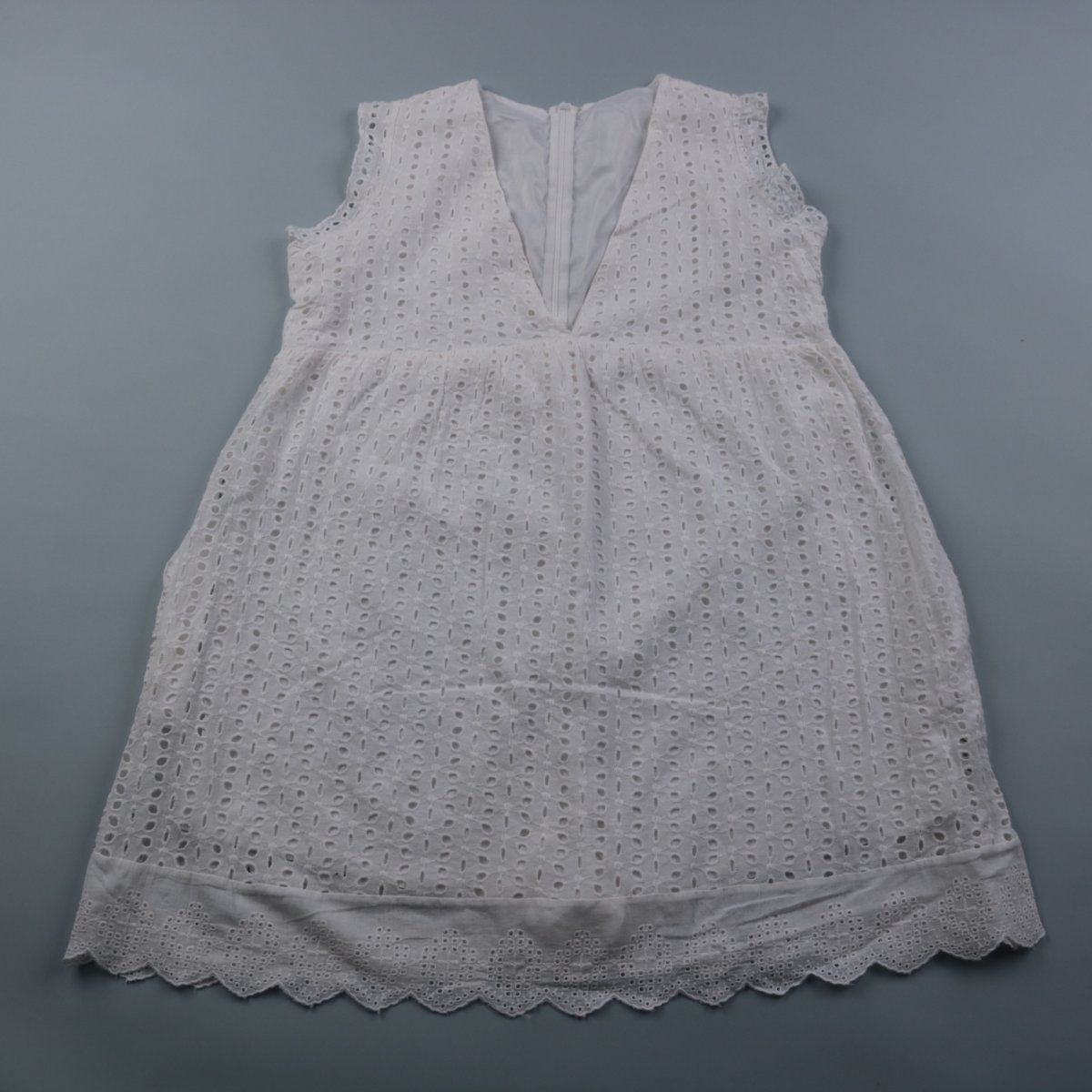 Белое хлопковое платье без рукавов с фактурной вышивкой (перфорация) и фигурной каймой по низу, застёгивается на молнию сзади. Подойдёт для лета, праздников и прогулок. Натуральный хлопок хорошо пропускает воздух и комфортен в жару.
