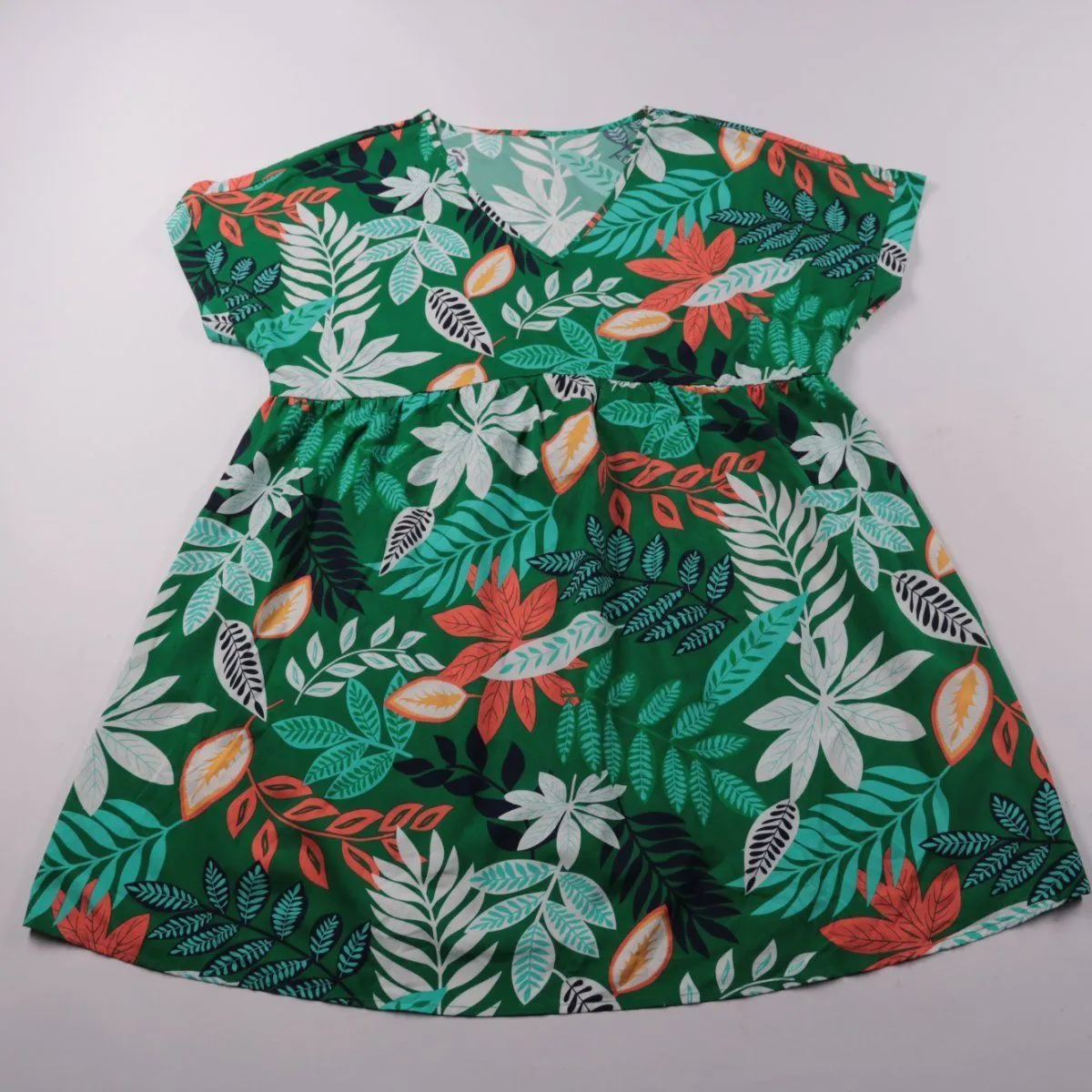 Летнее платье для девочки с короткими рукавами и тропическим принтом на зелёном фоне. Подойдёт для прогулок, детского сада и отдыха в тёплую погоду. Лёгкая ткань и свободный крой не стесняют движения.