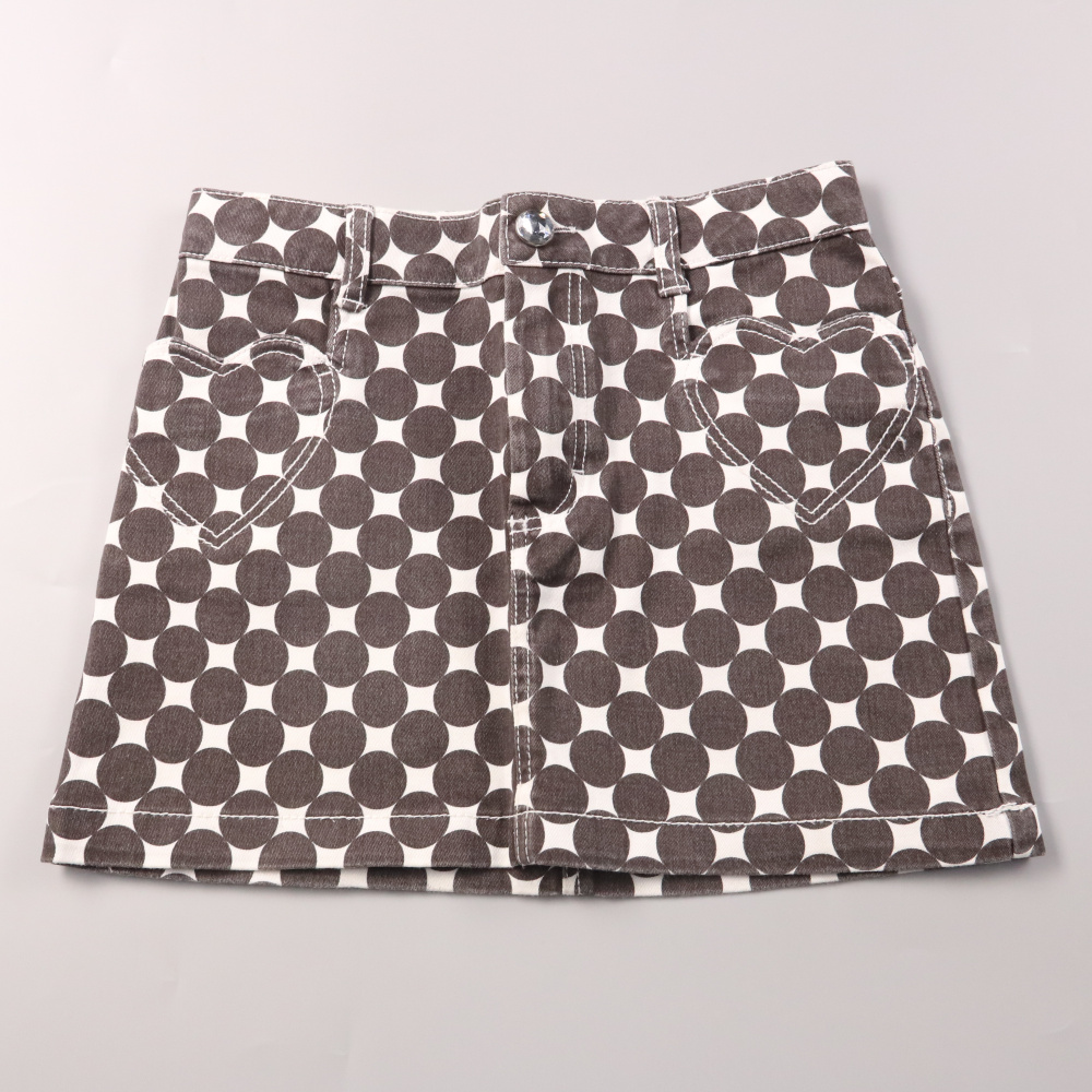 Юбка H&M для девочки, белая с серым принтом в крупный горох и застёжкой на пуговицу. Подойдёт для тёплой погоды и повседневных прогулок или в сад/школу с футболкой или блузкой. Хлопковая ткань с эластаном тянется и комфортно сидит по талии.