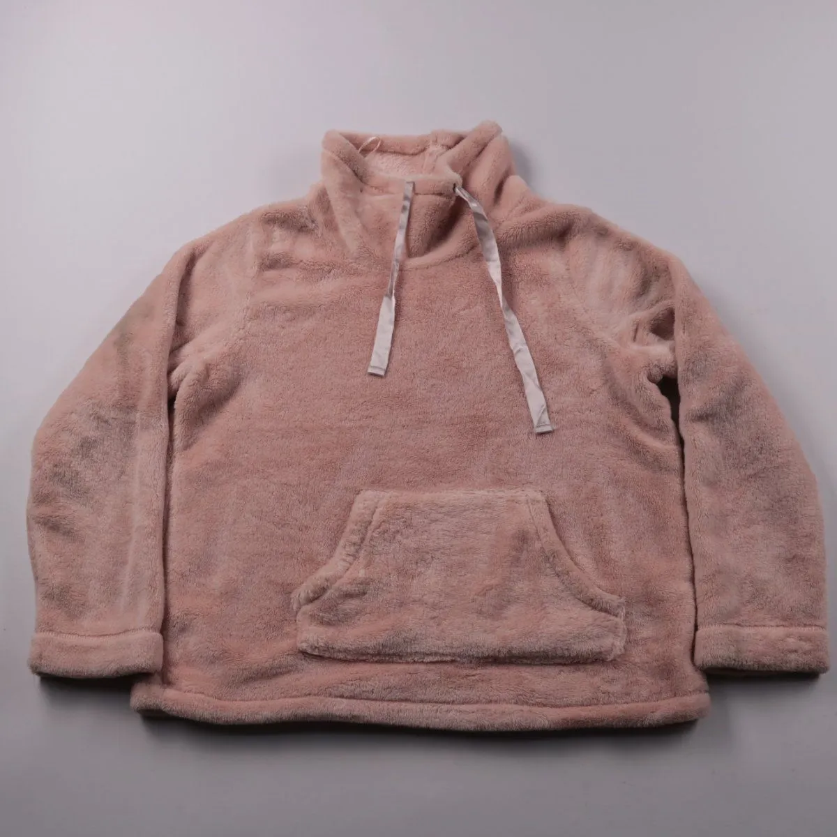 Мягкая плюшевая толстовка с высоким воротом и карманом-кенгуру, подойдёт для прогулок и дома в прохладную погоду. Нежный розово-персиковый цвет легко сочетается с джинсами и леггинсами. Ткань из 100% полиэстера быстро сохнет после стирки.