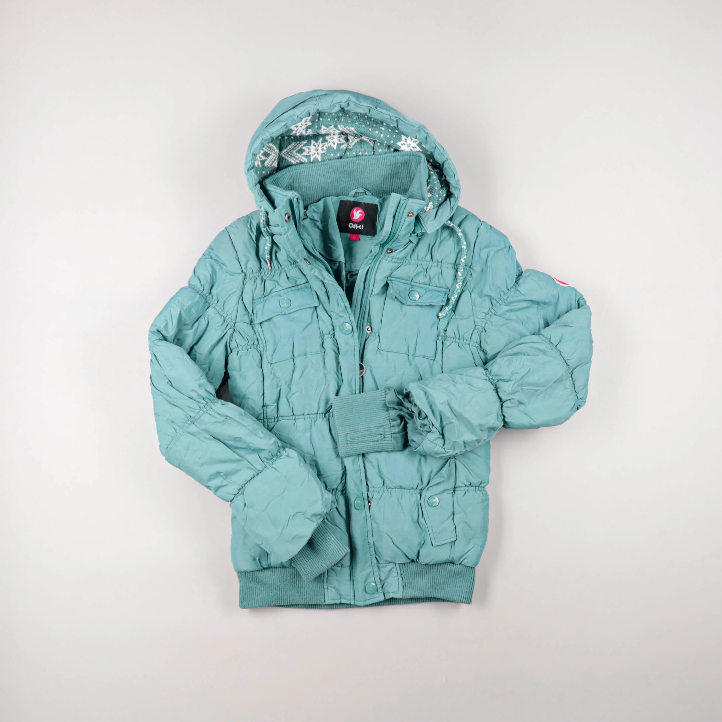 Зимняя куртка Qiki бирюзового цвета с капюшоном и стёгаными секциями. Подойдёт для прогулок в холодную погоду, манжеты и нижняя резинка помогают держать тепло и не продуваться. Практичные карманы и застёжка на молнию делают куртку удобной на каждый день.