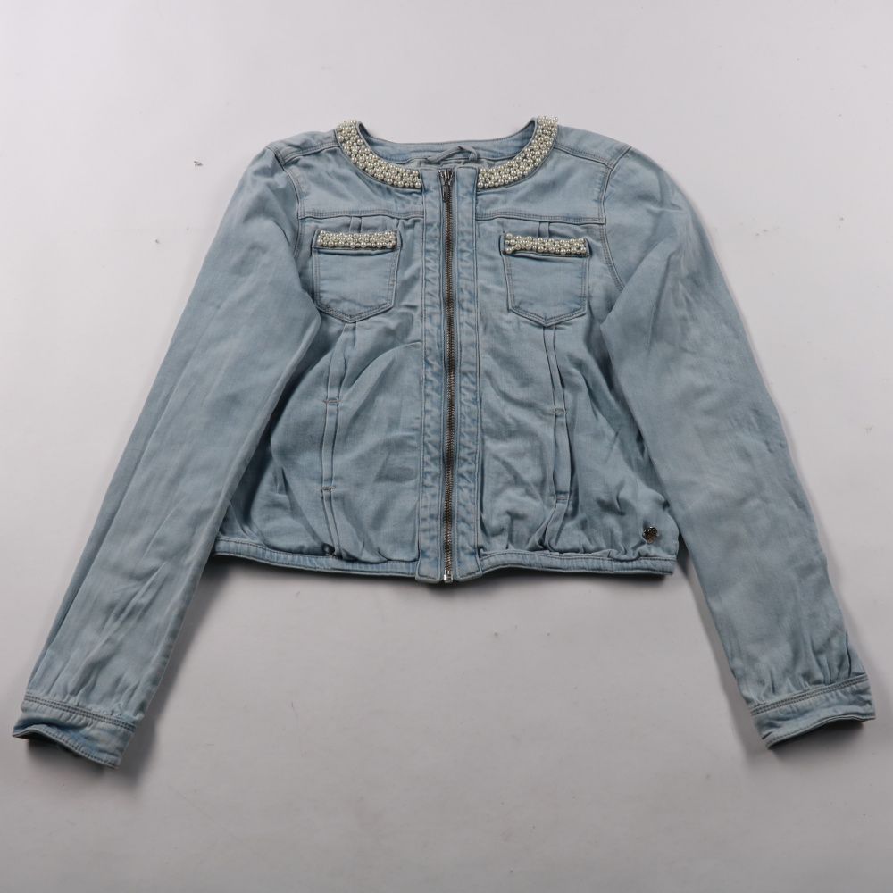 Джинсовая куртка JBC MillaStar светло-голубого цвета, застёгивается на молнию и украшена бусинами по воротнику и на карманах. Подойдёт для школы и прогулок весной/осенью, хорошо сочетается с платьями и джинсами. Практичный плюс — плотный деним со стрей...