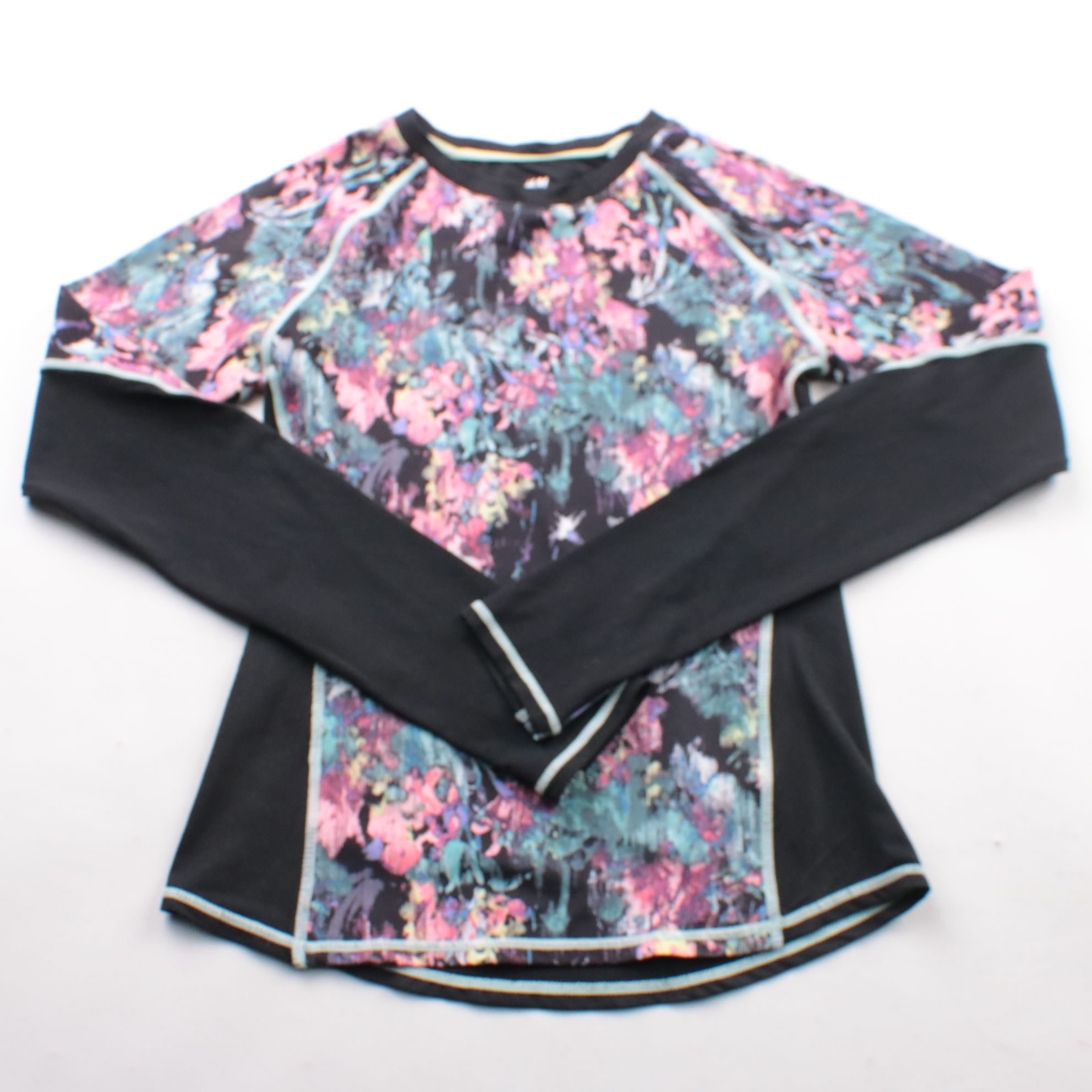 Спортивный лонгслив H&M Sport с ярким цветочным принтом и чёрными вставками по бокам. Подойдёт для тренировок, физкультуры и активных прогулок в прохладную погоду. Эластичная ткань хорошо тянется и быстро сохнет.