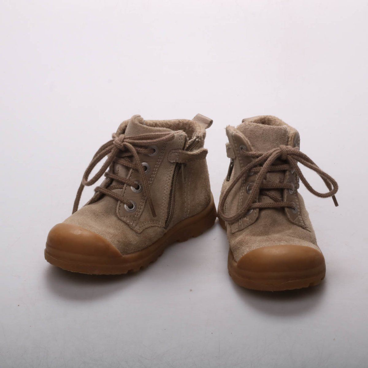 Детские замшевые ботинки Elefanten бежевого цвета на шнуровке, с боковой молнией и тёплой подкладкой. Подойдут для прогулок в прохладную погоду в межсезонье. Молния сбоку помогает быстро надевать и снимать обувь.