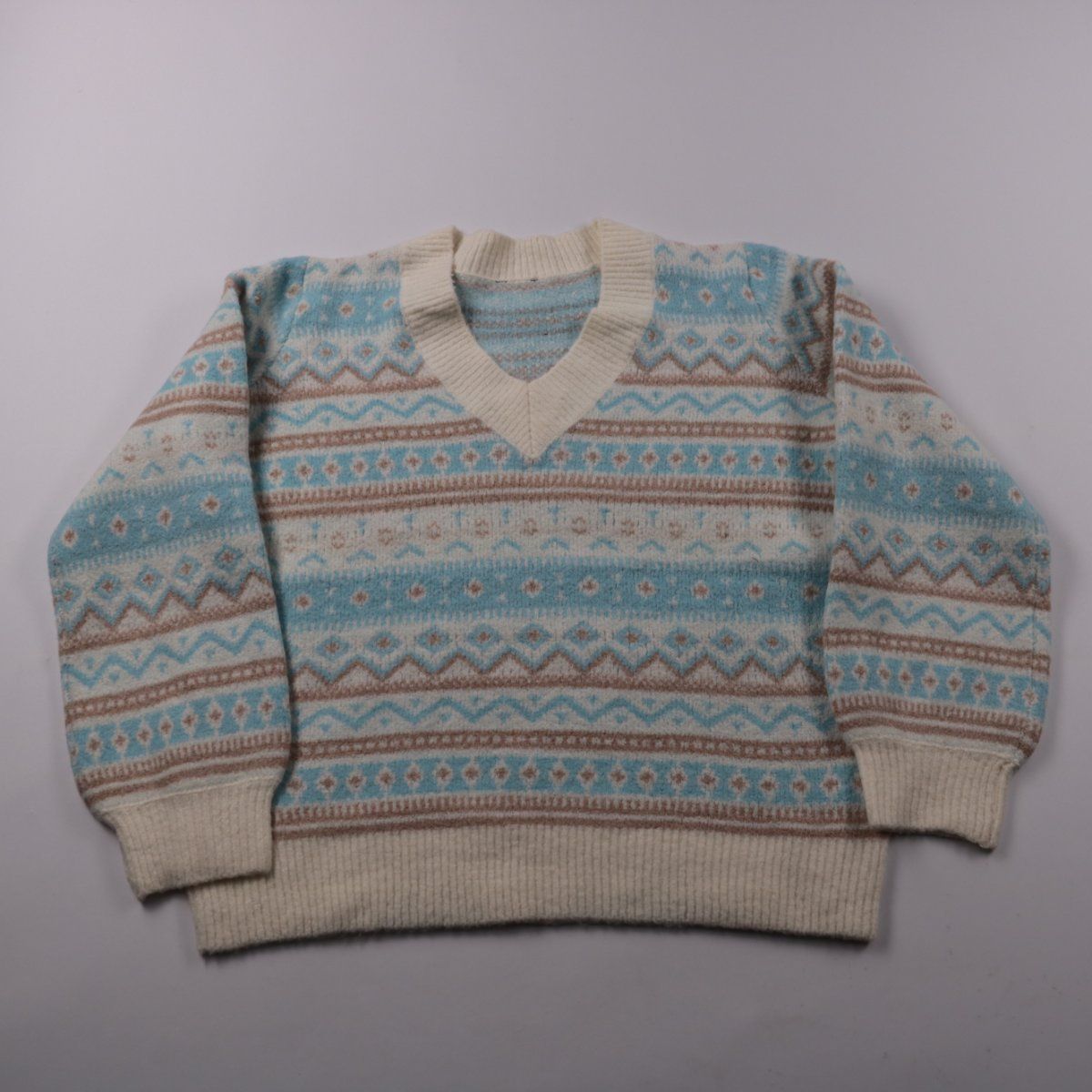 Вязаный свитер с V-образным вырезом и орнаментом в голубо-бежевых тонах. Подойдёт для школы и прогулок в прохладную погоду, удобно носить с рубашкой или водолазкой. Плотная вязка хорошо сохраняет тепло.
