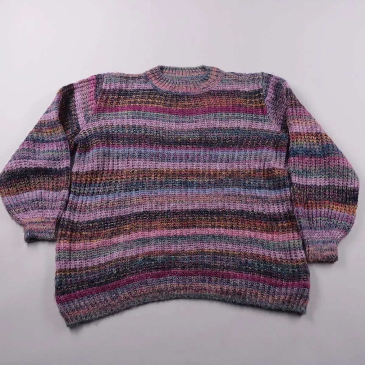 Вязаный свитер в разноцветную полоску, подойдёт мальчику или девочке для школы и прогулок в прохладную погоду. Мягкая фактура и свободная посадка не стесняют движений. Практичен тем, что легко сочетается с джинсами и брюками.