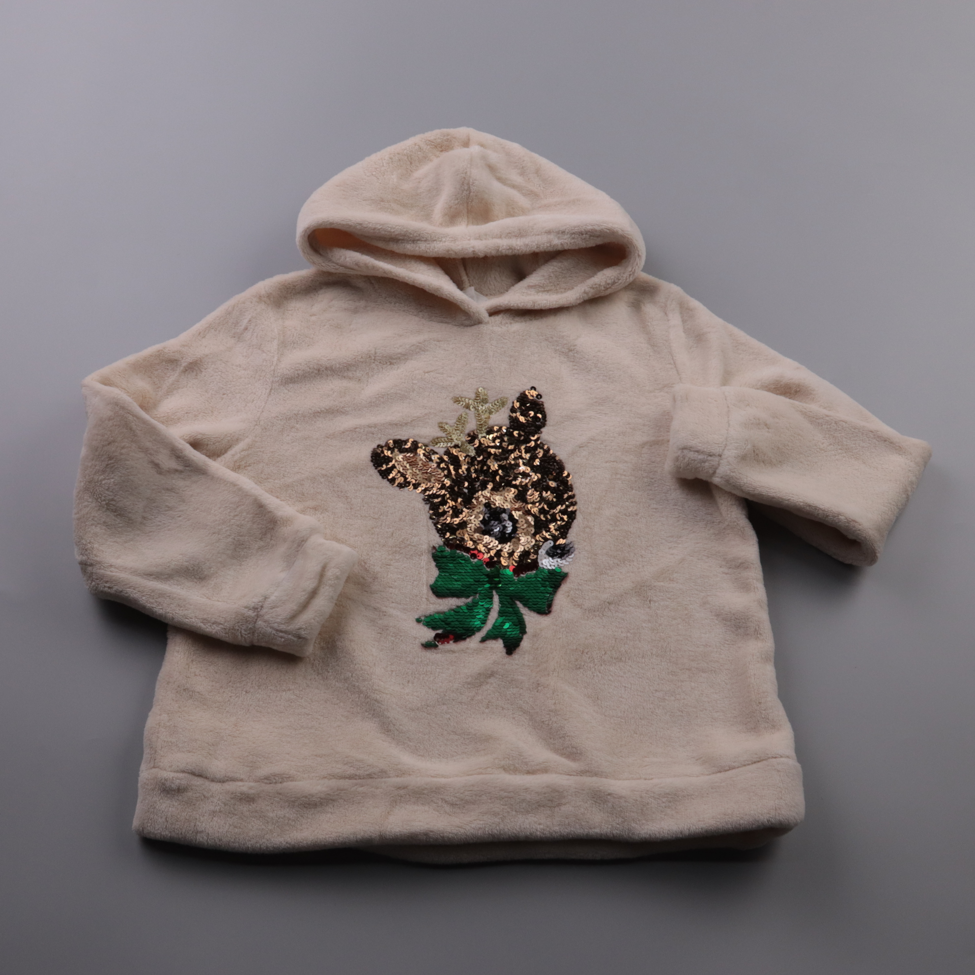 Плюшевая толстовка H&M с капюшоном и аппликацией из пайеток в виде оленёнка. Подойдёт для прогулок и детского сада в прохладную погоду. Мягкий полиэстер быстро сохнет и простой в уходе.