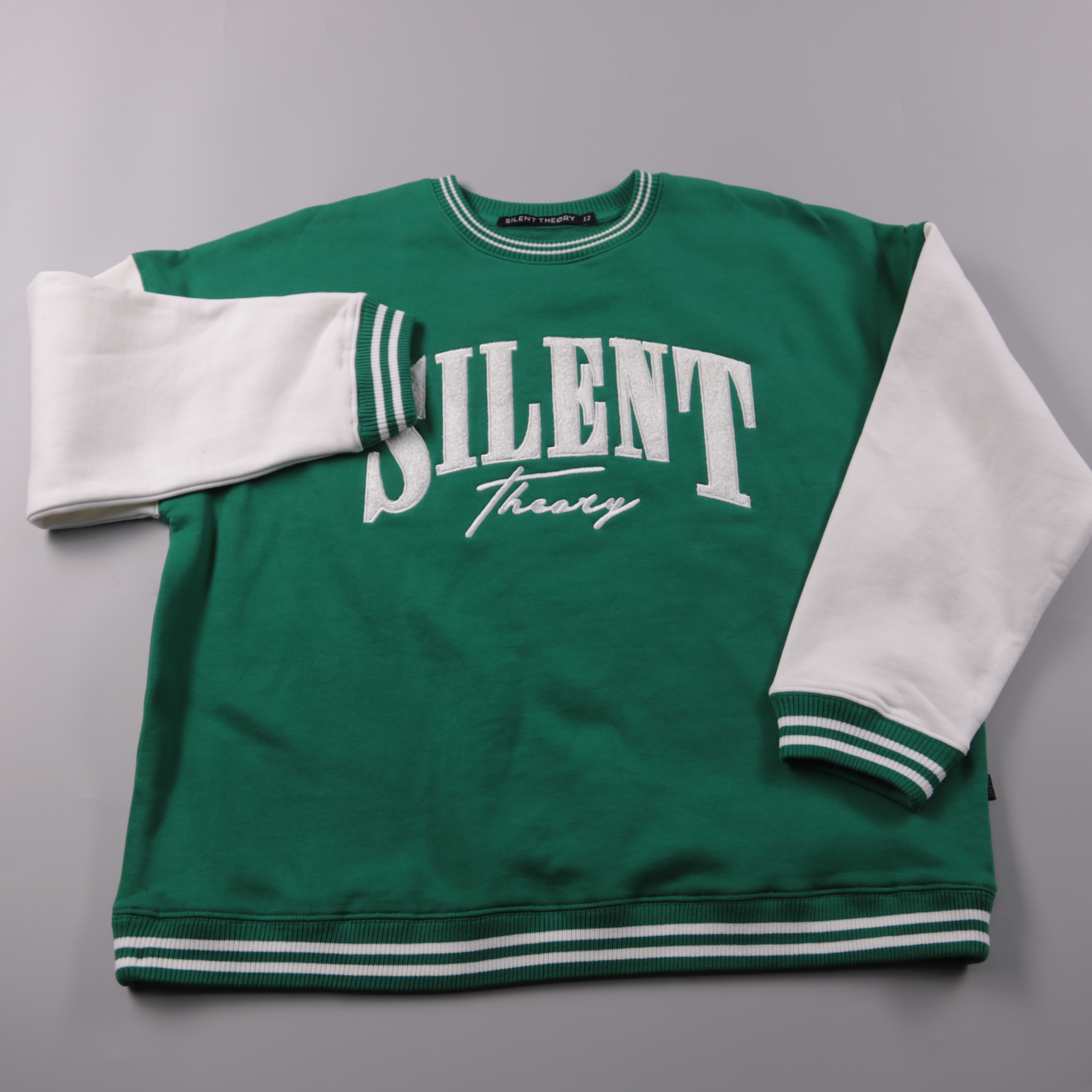 Толстовка Silent Theory в зелёно-белой расцветке с вышитым логотипом спереди и контрастными рукавами. Подойдёт для школы, прогулок и повседневной носки в прохладную погоду. Мягкая изнанка и эластичные манжеты помогают сохранять тепло и комфортно сидят ...