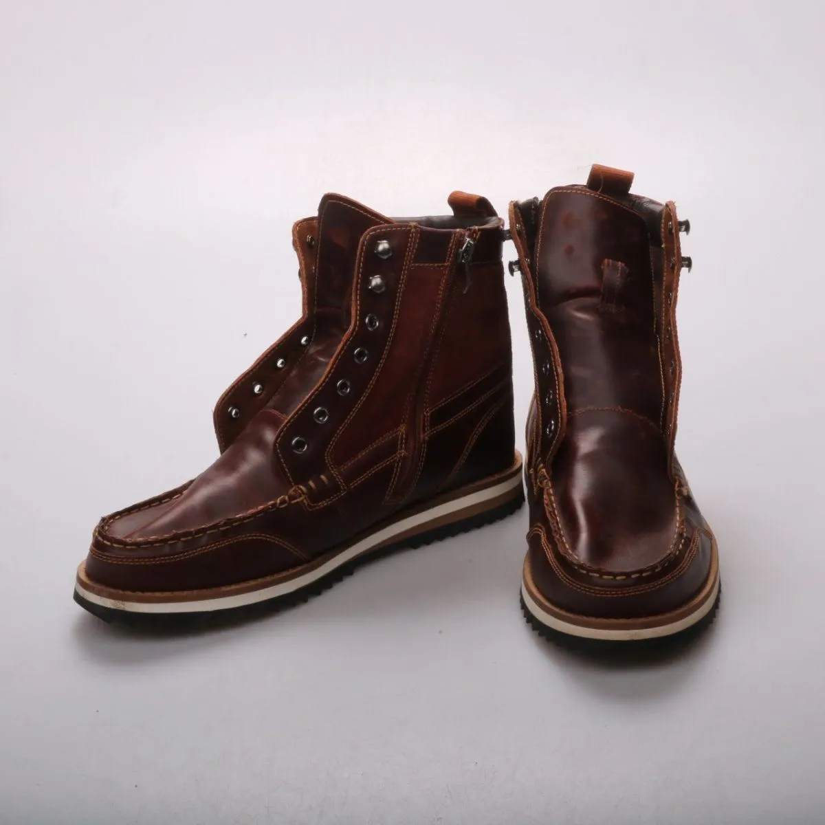 Мужские кожаные ботинки со вставками из замши и боковой молнией для удобного надевания. Подойдут для повседневной носки в городе в прохладную погоду, хорошо сочетаются с джинсами и чиносами. Рельефная резиновая подошва даёт уверенное сцепление на мокром асфальте.