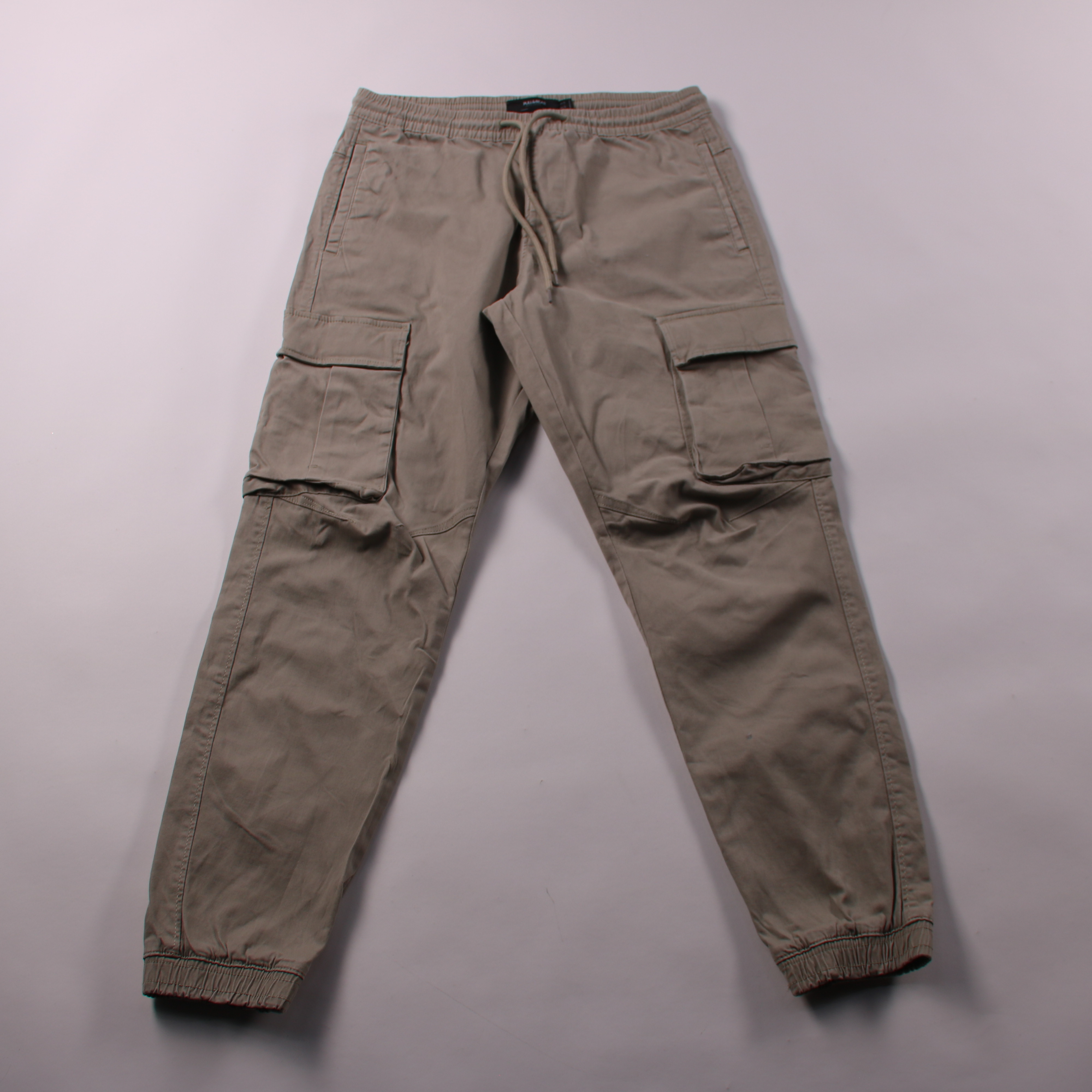 Мужские карго-джоггеры Pull&Bear бежевого цвета с эластичным поясом на шнурке и накладными карманами. Подойдут для повседневных образов и прогулок в городе. Практичный плюс — удобная посадка и вместительные карманы.