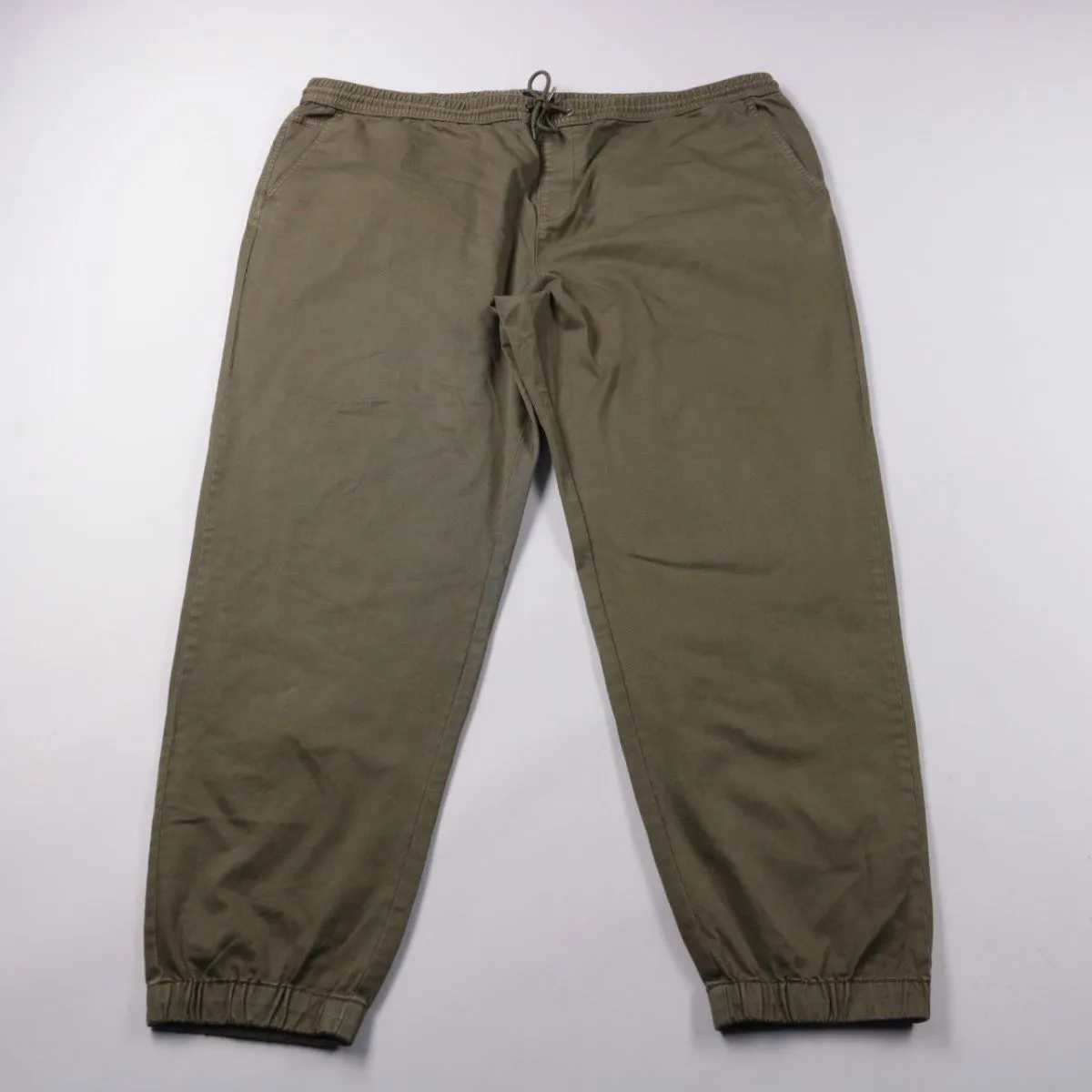 Мужские брюки River Island в стиле casual, оливкового цвета, с эластичным поясом на шнурке и манжетами снизу. Подойдут для повседневной носки и прогулок в тёплый сезон и межсезонье. Практичны за счёт удобной посадки и мягкой ткани со стрейчем.