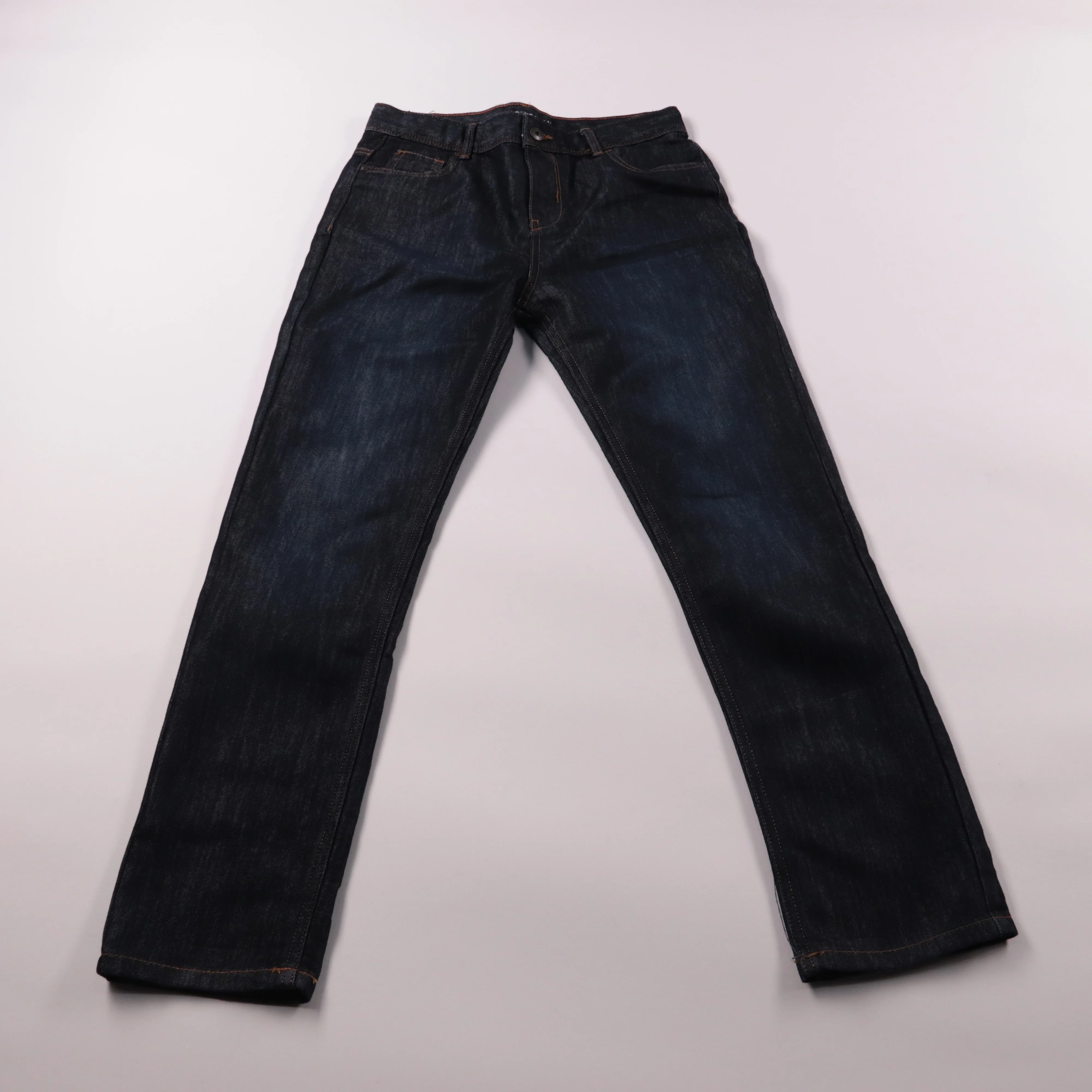 Джинсы Primark из тёмно-синего денима прямого кроя, с классической посадкой и контрастной строчкой. Подойдут на каждый день и для школы/прогулок, легко сочетаются с худи, рубашками и кедами. Плотная ткань хорошо держит форму и не так быстро протирается.