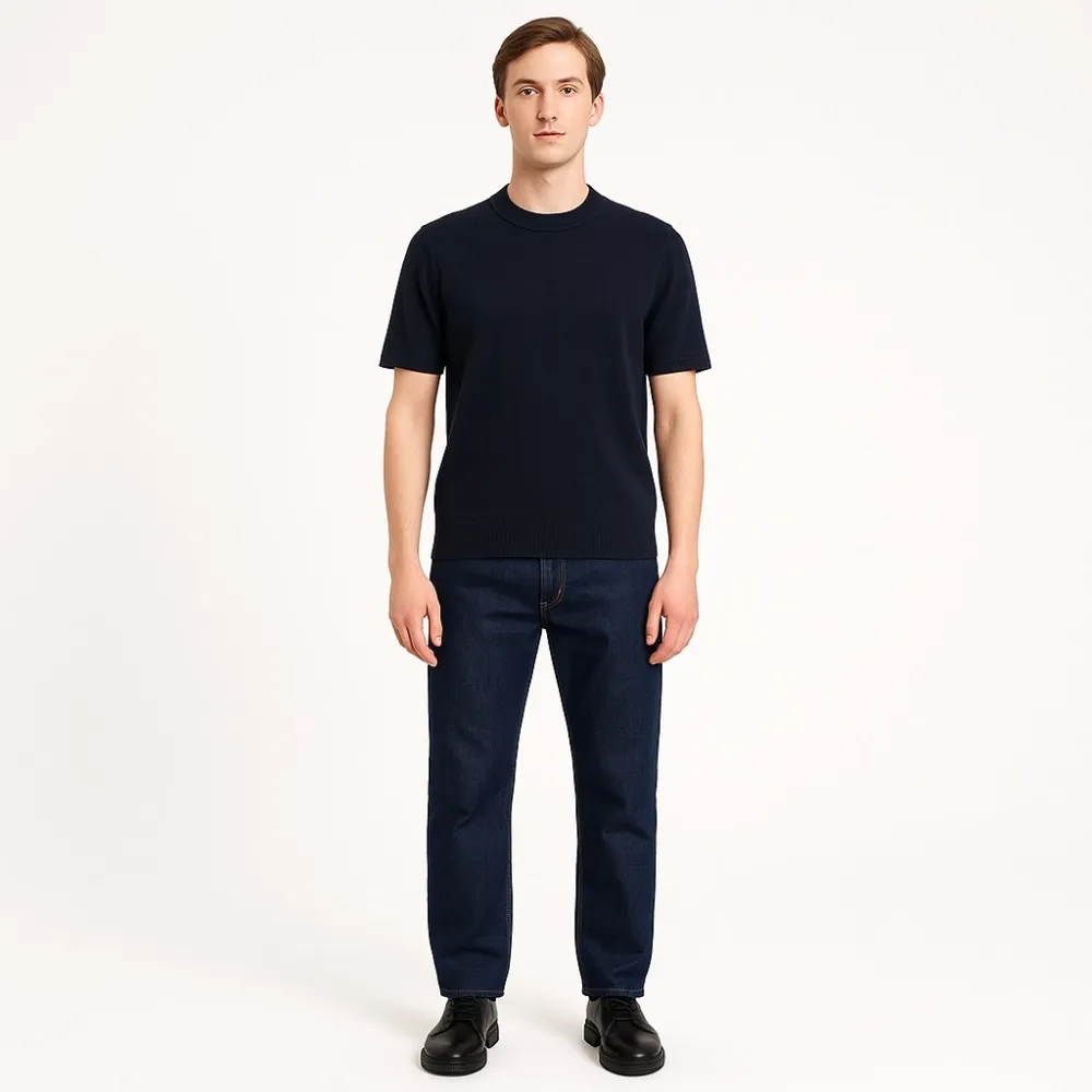 Мужской джемпер M&S Collection тёмно-синего цвета, лаконичный базовый вариант на каждый день. Подойдёт для офиса в стиле casual и для прогулок, легко сочетается с джинсами и брюками. Практичный акриловый трикотаж прост в уходе и быстро сохнет.