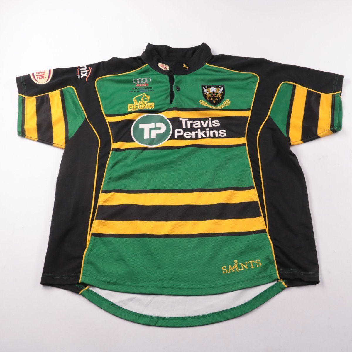 Мужское спортивное поло Kooga в стиле регбийной формы с коротким рукавом и воротником на пуговицах. Дизайн в зелёно-чёрно-жёлтую полоску с клубной/спонсорской символикой, подойдёт для спорта и повседневной носки. Материал из полиэстера быстро сохнет и неприхотлив в уходе.