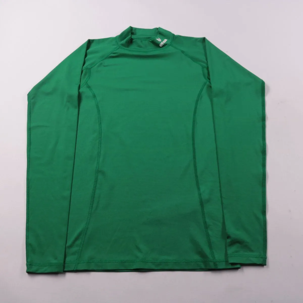Мужская спортивная кофта (лонгслив) Erima зелёного цвета с длинным рукавом и высоким воротом. Подойдёт для тренировок и активного спорта как базовый слой благодаря эластичному материалу и плоским швам. Быстро сохнет и комфортно сидит по фигуре.