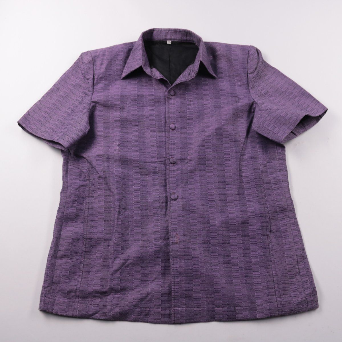 Мужская рубашка с коротким рукавом фиолетового цвета с фактурным рисунком ткани. Подойдёт для повседневной носки и нестрогого офиса, хорошо сочетается с джинсами или классическими брюками. Практичный плюс — плотный материал и удобная застёжка на пуговицах.