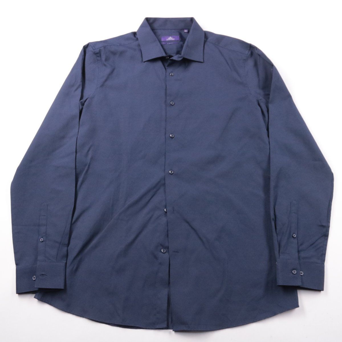 Мужская рубашка Next Shirtinng Slim Fit тёмно-синего цвета с длинным рукавом и классическим воротником. Подойдёт для офиса, деловых встреч и мероприятий, легко сочетается с брюками и джинсами. Смесовая ткань (хлопок с полиэстером) меньше мнётся и проще в уходе.