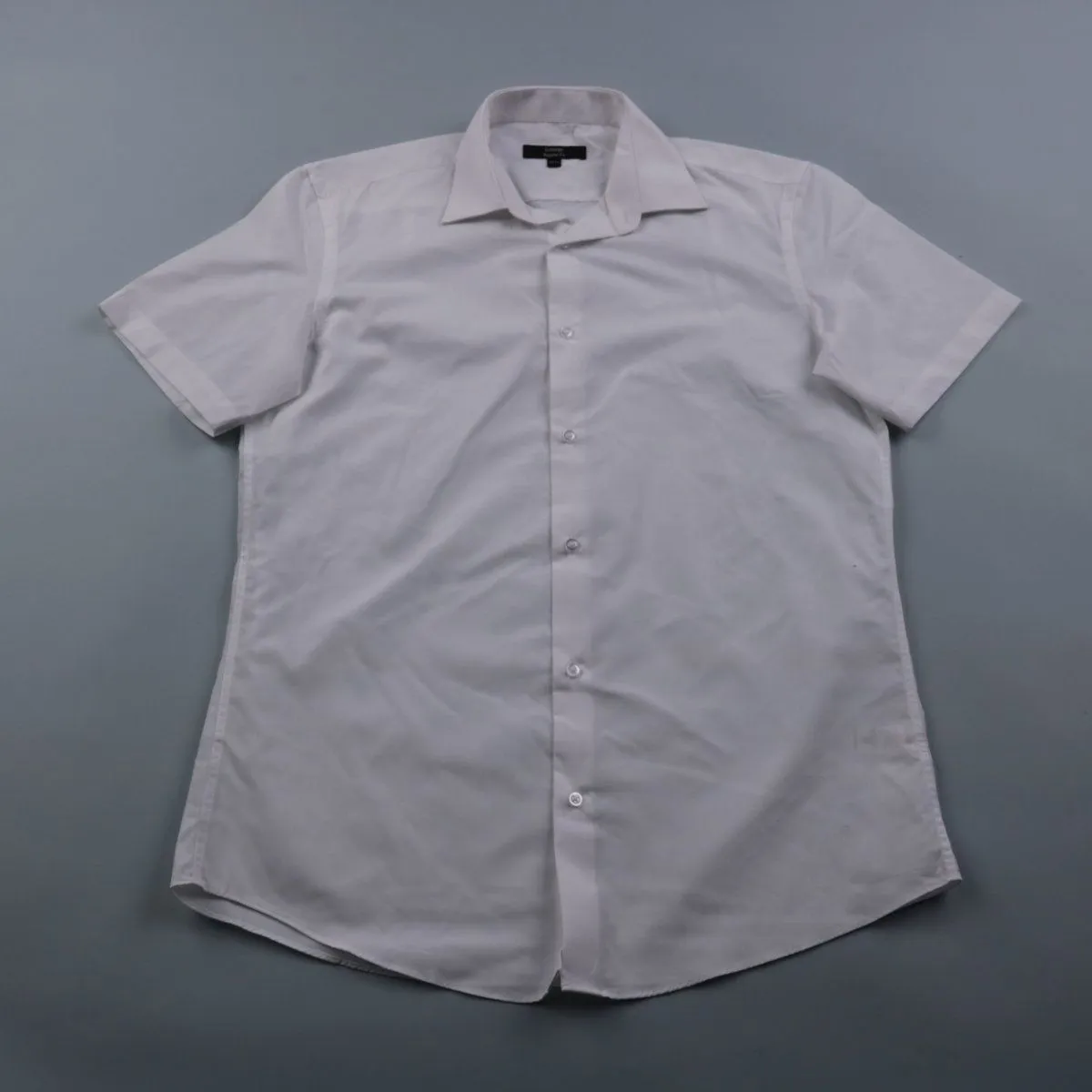 Мужская рубашка George Regular Fit белого цвета с коротким рукавом и классическим воротником на пуговицах. Подойдёт для офиса, школы или летних образов в стиле smart casual. Смесовая ткань хлопок/полиэстер меньше мнётся и проще в уходе.