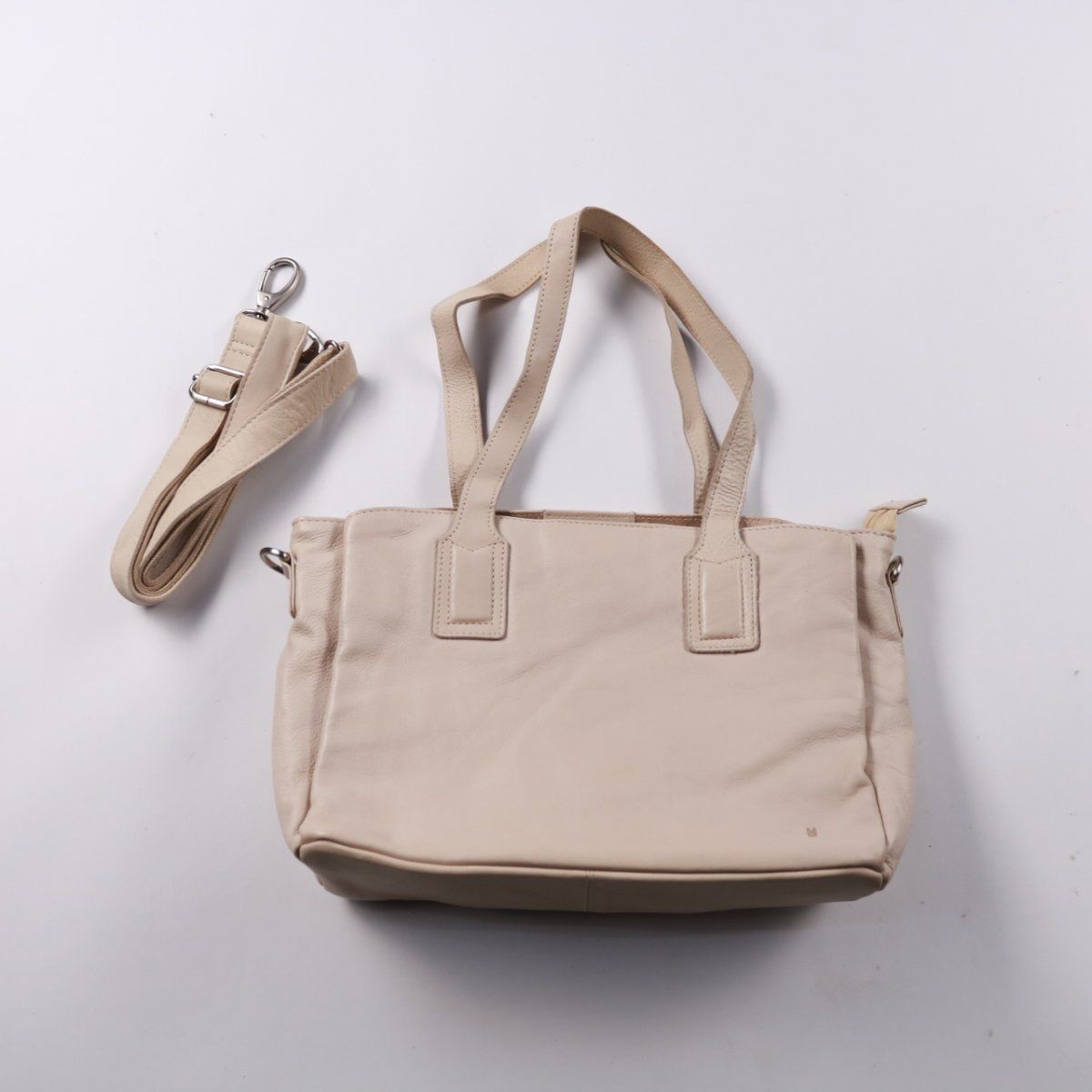 Женская сумка в бежевом цвете с короткими ручками и съёмным ремнём, можно носить в руке или на плече. Подойдёт для повседневных дел и работы благодаря нескольким внутренним отделениям. Практичный вариант: удобная организация вещей и застёжка на молнию сверху.