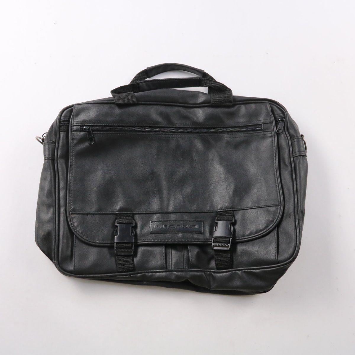 Сумка из искусственной кожи чёрного цвета с ручками и клапаном на фастексах. Подойдёт для повседневных дел, учёбы или работы, чтобы носить документы и мелкие вещи. Спереди есть карман на молнии и дополнительные отделения для удобной организации.