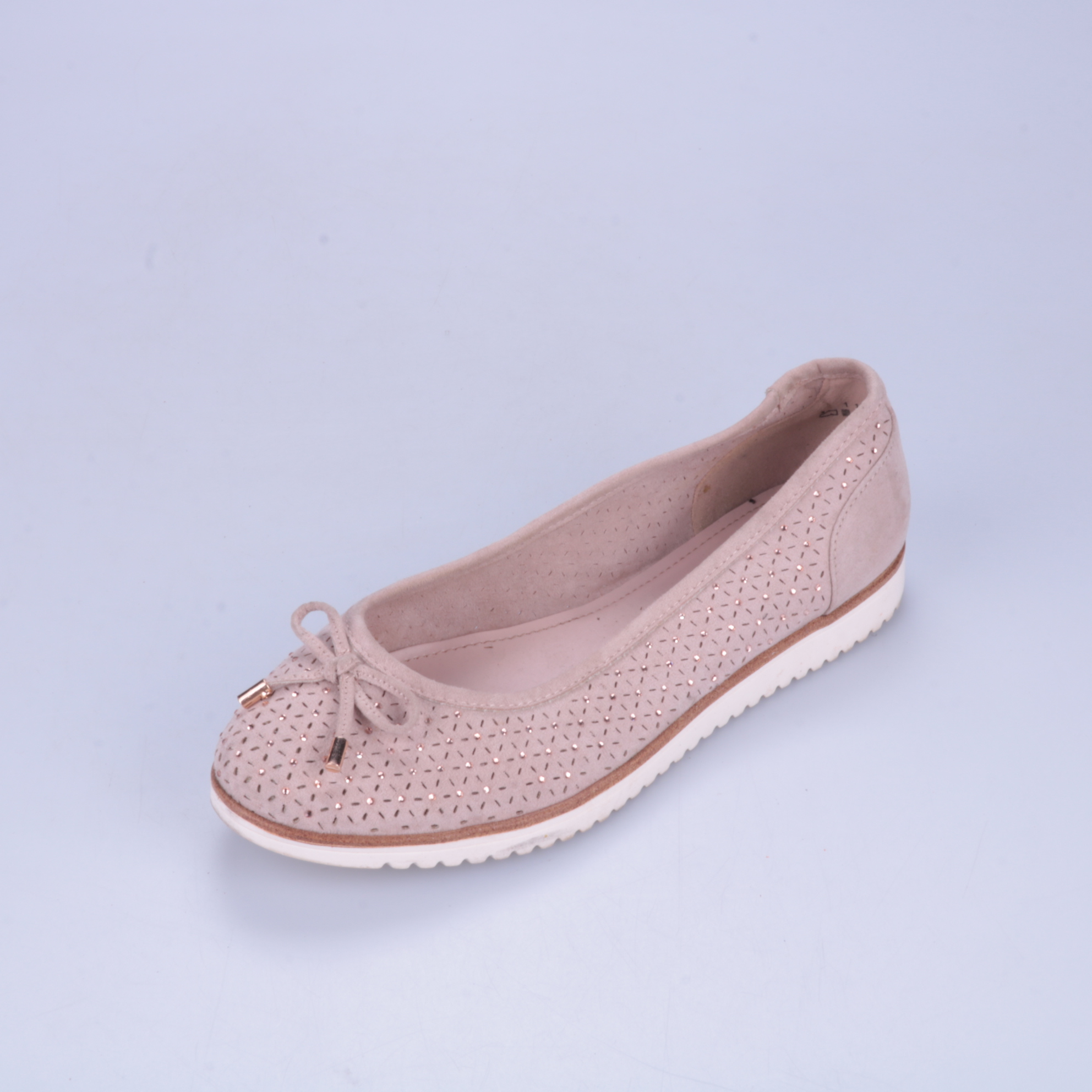 Балетки Graceland в нежно-розовом цвете с перфорацией и небольшим бантиком спереди. Подойдут для повседневных летних прогулок и офиса, хорошо сочетаются с платьями и джинсами. Лёгкая гибкая подошва делает их удобными для долгой ходьбы.
