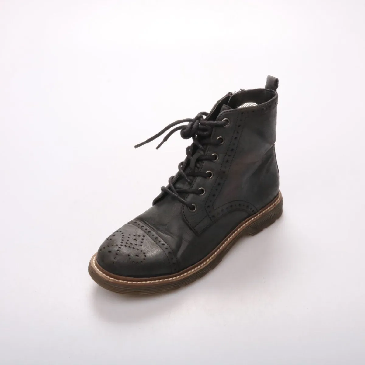 Женские ботинки Catwalk в стиле броги: чёрные, на шнуровке с боковой молнией и перфорацией на мысе. Подойдут для повседневной носки осенью и весной, хорошо сочетаются с джинсами и платьями. Рифлёная подошва даёт более уверенное сцепление и удобна для города.