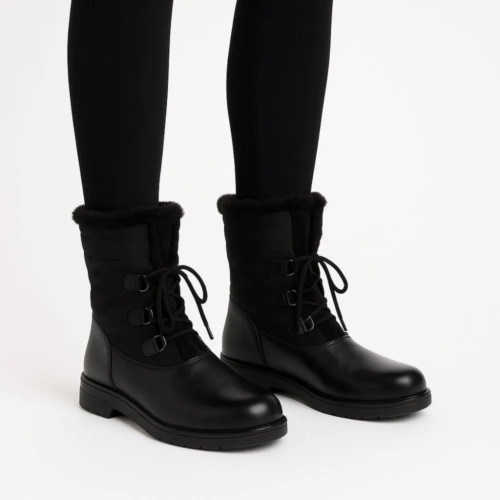 Зимние сапоги с утеплённой меховой подкладкой и шнуровкой, выполнены в чёрном цвете. Подойдут для повседневной носки в холодную погоду, удобная молния сбоку ускоряет надевание. Рифлёная подошва даёт лучшее сцепление на скользких поверхностях.