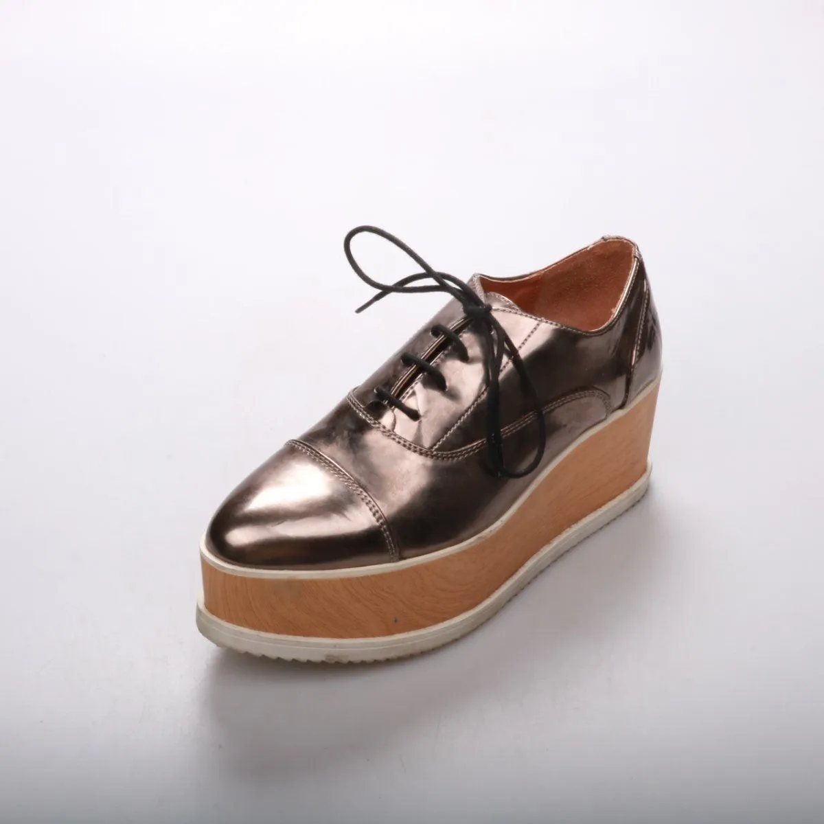 Туфли H&M на высокой платформе с шнуровкой и металлическим блеском. Подойдут для повседневных городских образов и для вечерних выходов, когда хочется добавить высоты без каблука. Рифлёная подошва даёт более уверенное сцепление при ходьбе.