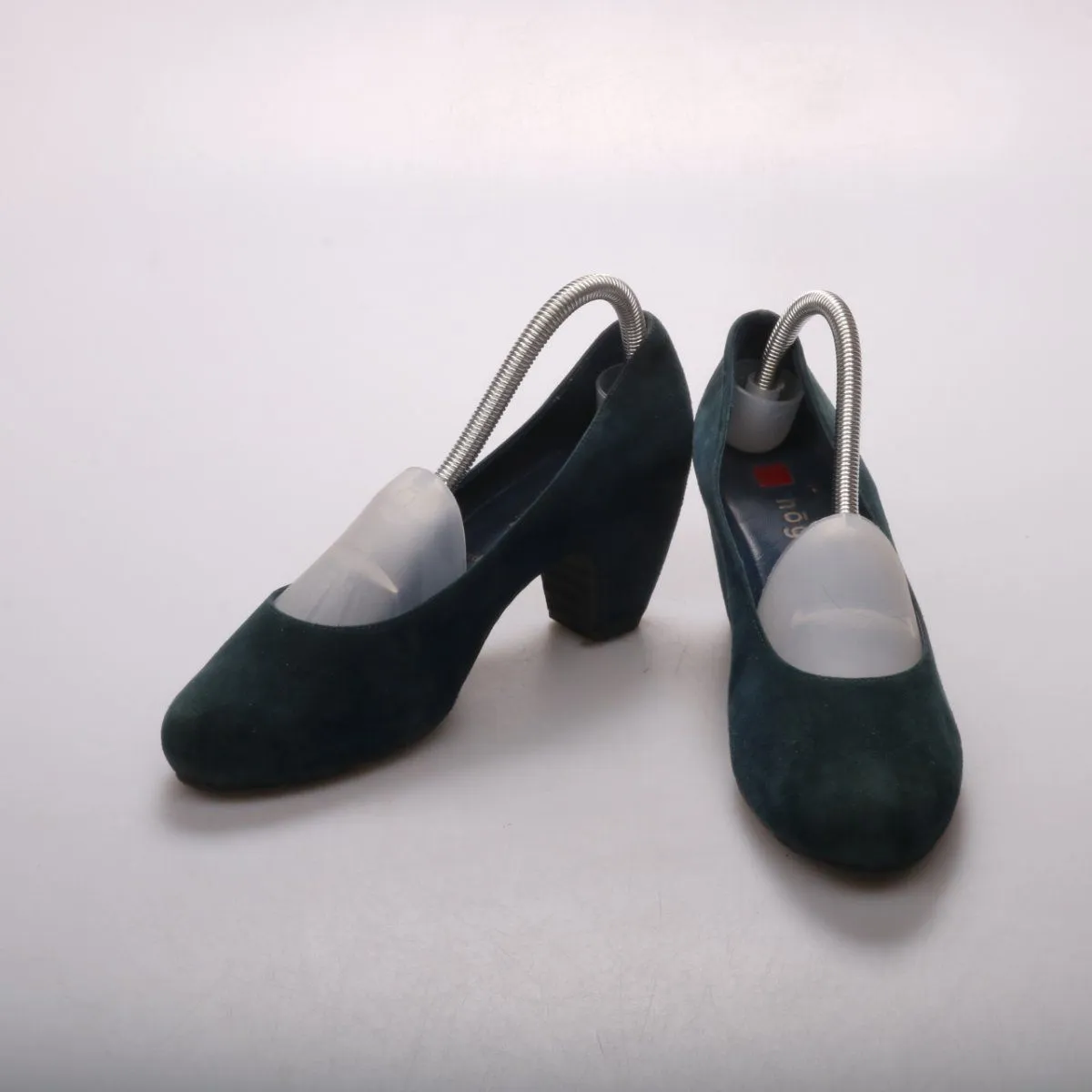 Туфли Gabor из тёмно-зелёной замши на устойчивом каблуке. Подойдут для офиса и повседневных образов в демисезон, хорошо смотрятся с платьями и брюками. Практичный плюс — удобный широкий каблук и закрытый носок.
