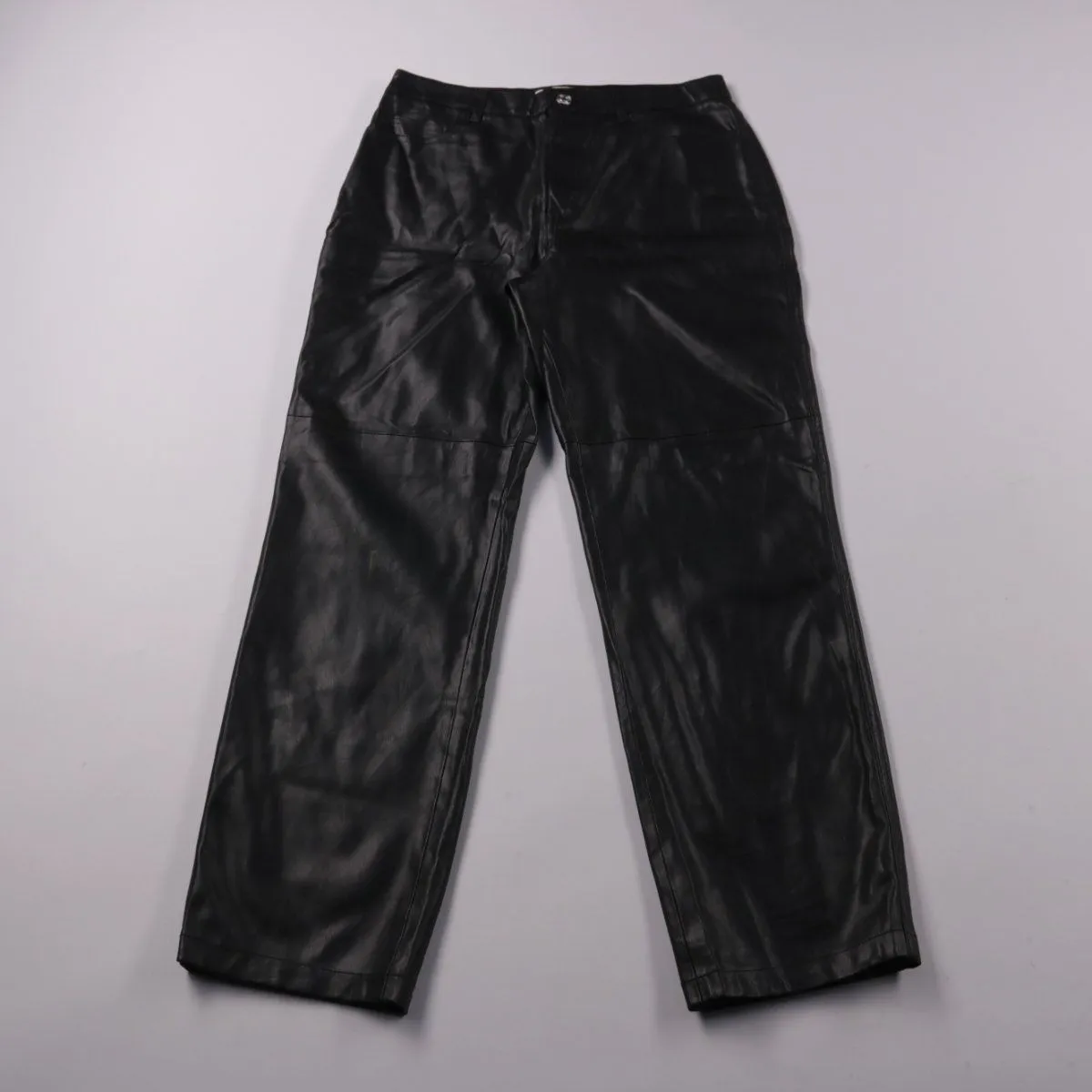 Женские брюки Mango из мягкой чёрной экокожи с прямыми штанинами и высокой посадкой. Подойдут для повседневных образов и на выход в прохладную погоду, хорошо сочетаются с ботинками и кроссовками. Материал легко протирается и не требует сложного ухода.