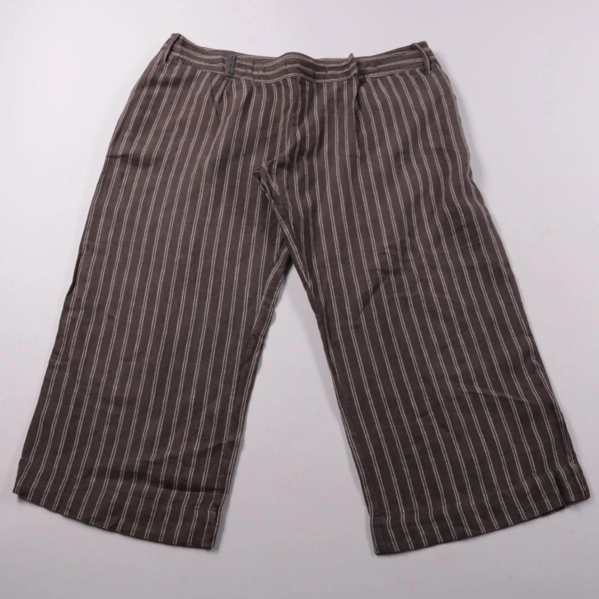 Льняные брюки Esprit в коричневом цвете с вертикальной белой полоской. Подойдут для лета и отдыха, легко сочетаются с однотонными топами и рубашками. Натуральный лен хорошо дышит и комфортен в жару.