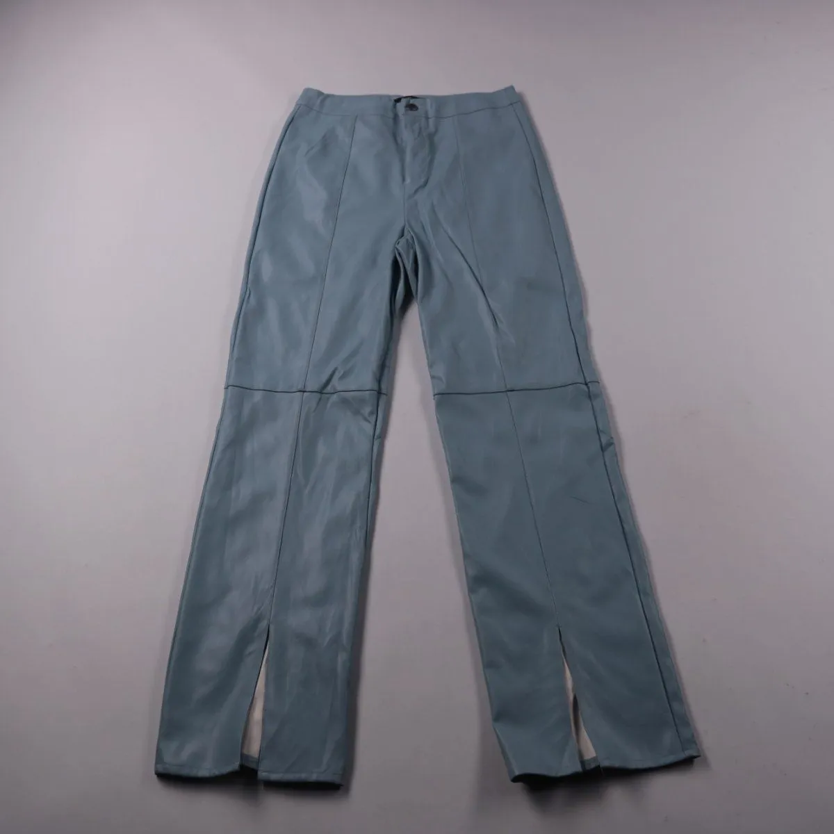 Брюки Missguided из экокожи в светло-голубом цвете, прямой крой с декоративными швами и разрезами снизу. Подойдут для повседневных и вечерних образов с топами, рубашками и жакетами. Практичный плюс — материал легко протирается и быстро приводитcя в аккуратный вид.