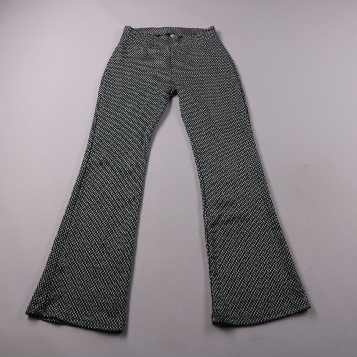 Женские брюки с мелким геометрическим узором в зелёно-белой гамме и слегка расклешёнными штанинами. Подойдут для повседневных образов и офиса с однотонным верхом. Практичны тем, что ткань выглядит немнущейся и проста в уходе.