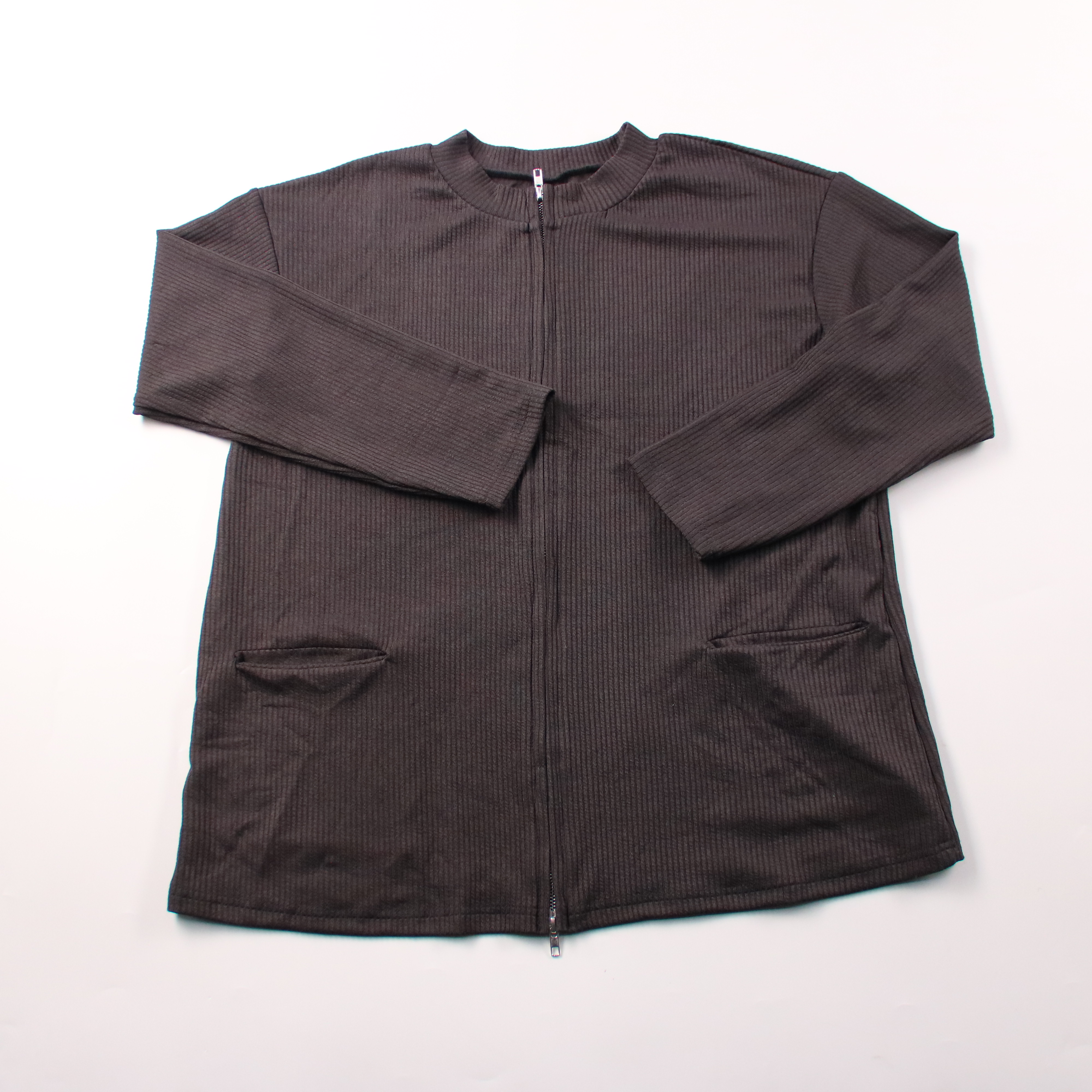 Женский кардиган в рубчик на молнии, размер M, чёрного цвета. Подойдёт для повседневной носки и в офис — удобно носить как верхний слой поверх топа или водолазки. Практичный плюс: ткань хорошо тянется и почти не мнётся.