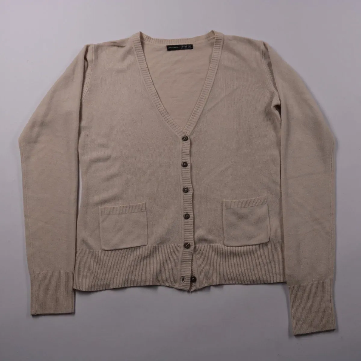 Кардиган Atmosphere бежевого цвета с V-образным вырезом, застёжкой на пуговицы и двумя накладными карманами. Подойдёт для офиса и повседневных образов в прохладную погоду, легко сочетается с джинсами и юбками. Акриловый трикотаж практичный в уходе и быстро сохнет.