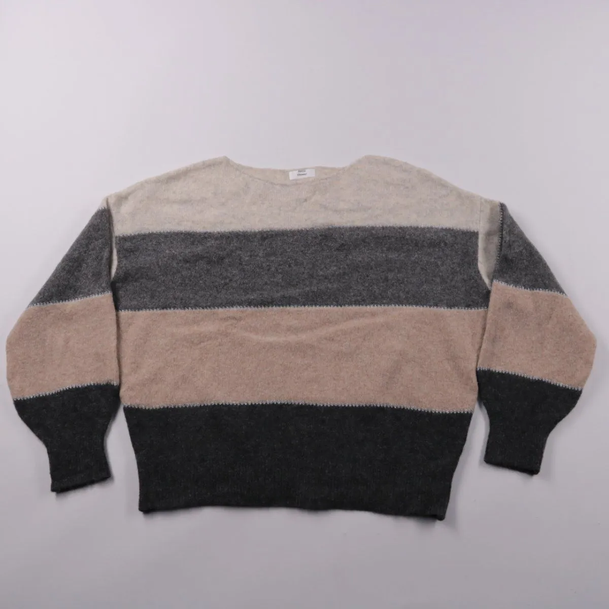 Джемпер Anna Wewer в широкую горизонтальную полоску в серо-бежевой гамме. Подойдёт для повседневных образов на прохладную погоду, хорошо сочетается с джинсами и брюками. Смесь мериносовой шерсти и яка делает его тёплым и приятным к телу.