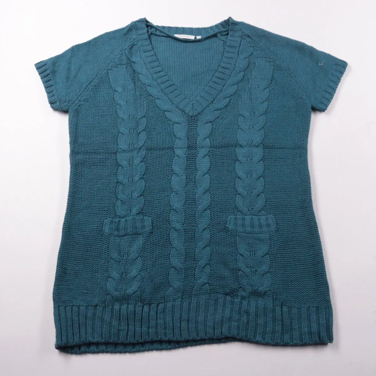 Вязаная кофта Yessica бирюзового цвета с V-образным вырезом, коротким рукавом и фактурными косами на передней части. Подойдёт для повседневных образов в прохладную погоду — с джинсами или юбкой. Мягкий акрил хорошо держит форму и прост в уходе.