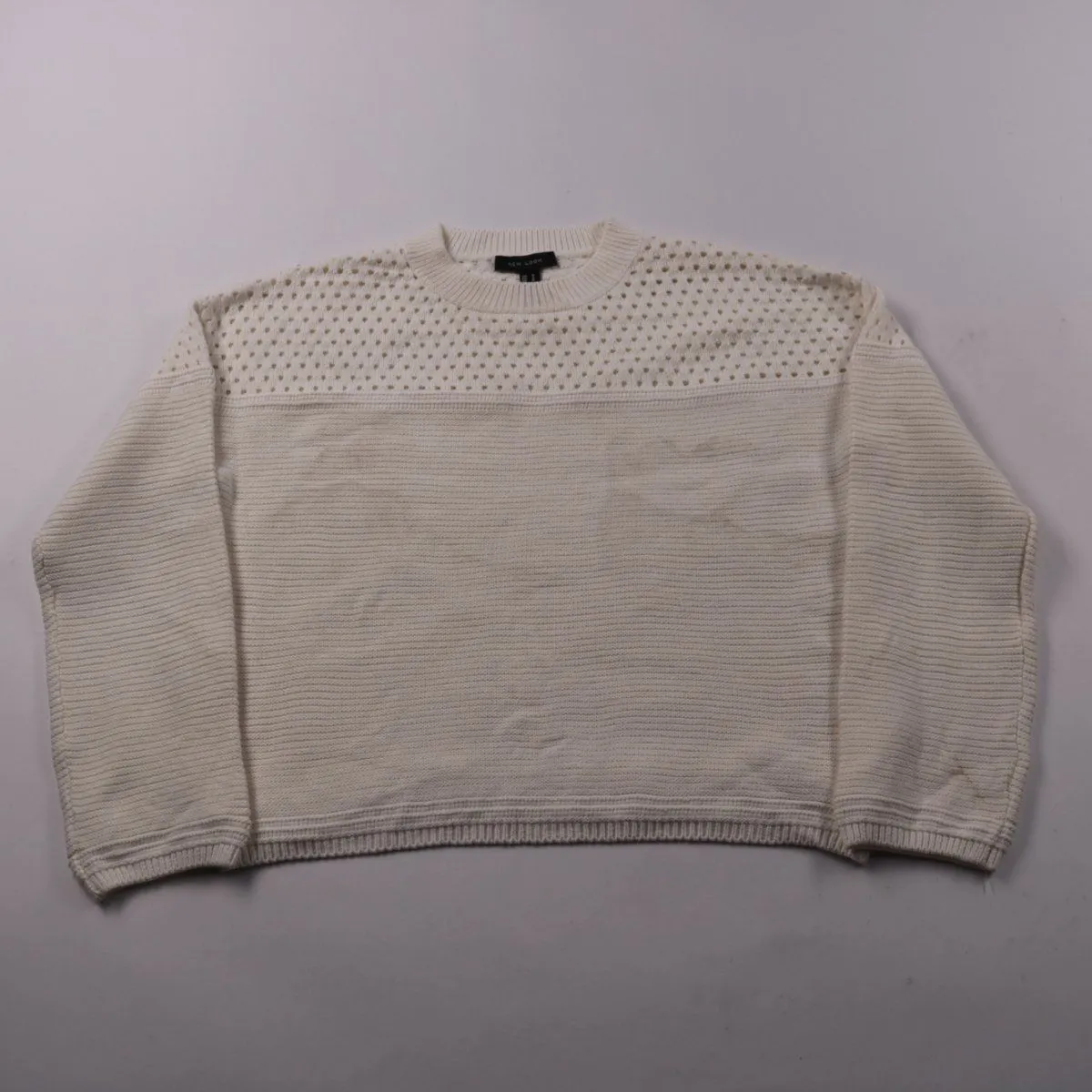 Вязаный джемпер New Look молочного оттенка с круглым вырезом и фактурной ажурной вставкой по линии груди. Подойдёт для повседневных образов в прохладную погоду, хорошо смотрится с джинсами и юбками. Смесовый состав с хлопком комфортен к телу и проще в уходе, чем чистая шерсть.