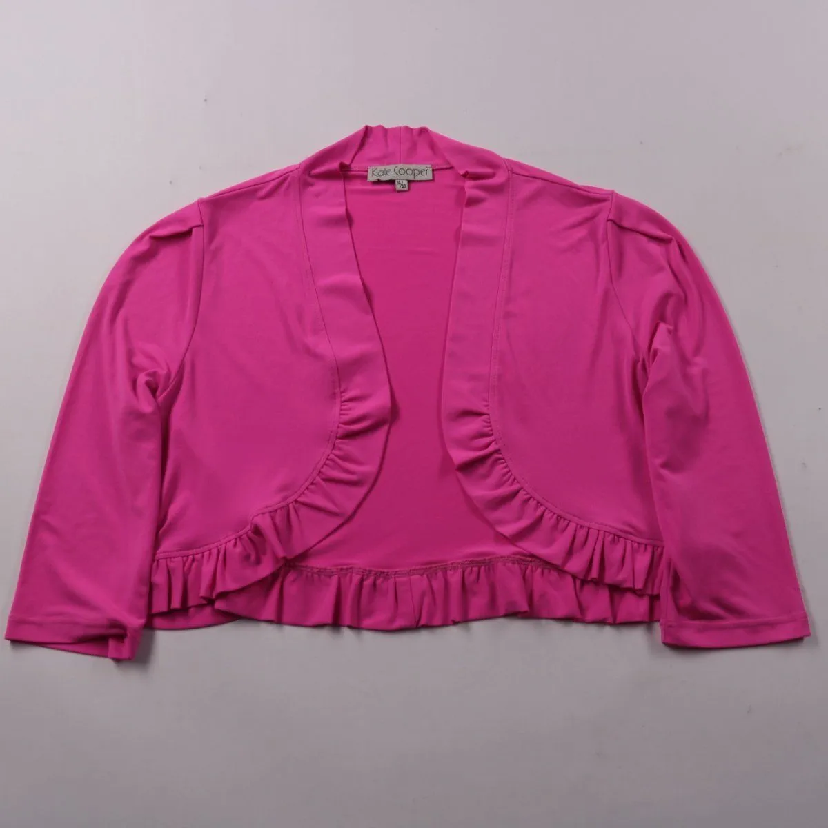 Короткий кардиган-болеро Kate Cooper ярко-розового цвета с открытым передом и оборками по краю. Подойдёт для образов с платьями и топами как лёгкий верхний слой. Эластичная ткань хорошо тянется и не сковывает движения.