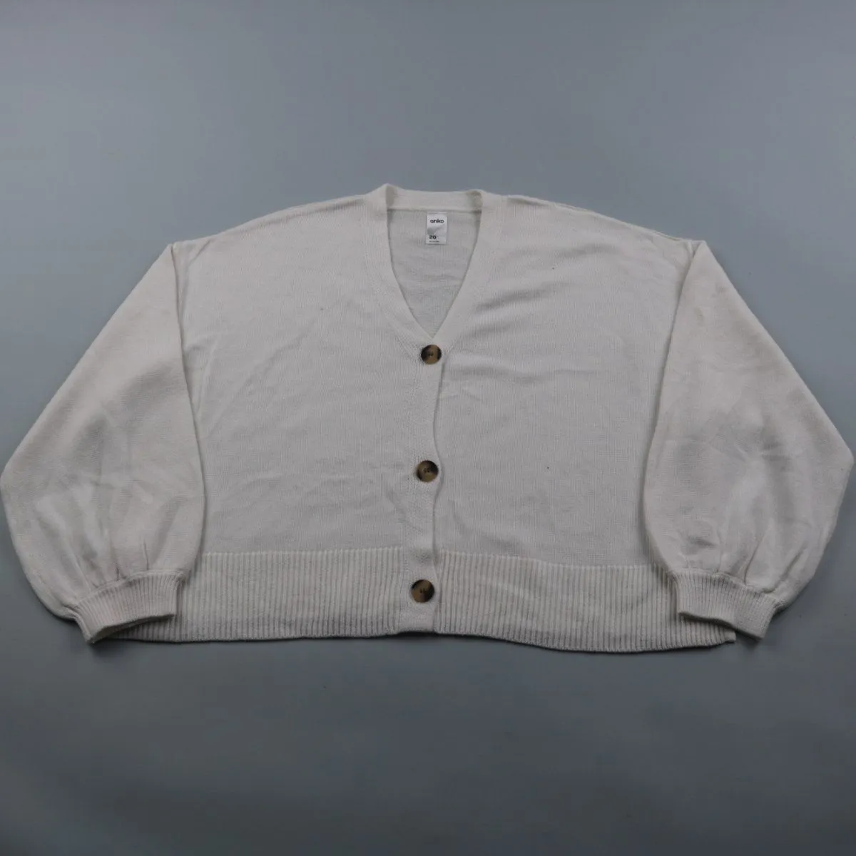 Вязаный кардиган Anko молочного цвета на пуговицах, с V-образным вырезом и манжетами на резинке. Подойдёт для повседневных образов и как второй слой в офис или прохладным вечером. Удобно регулировать посадку за счёт застёжки на пуговицы.