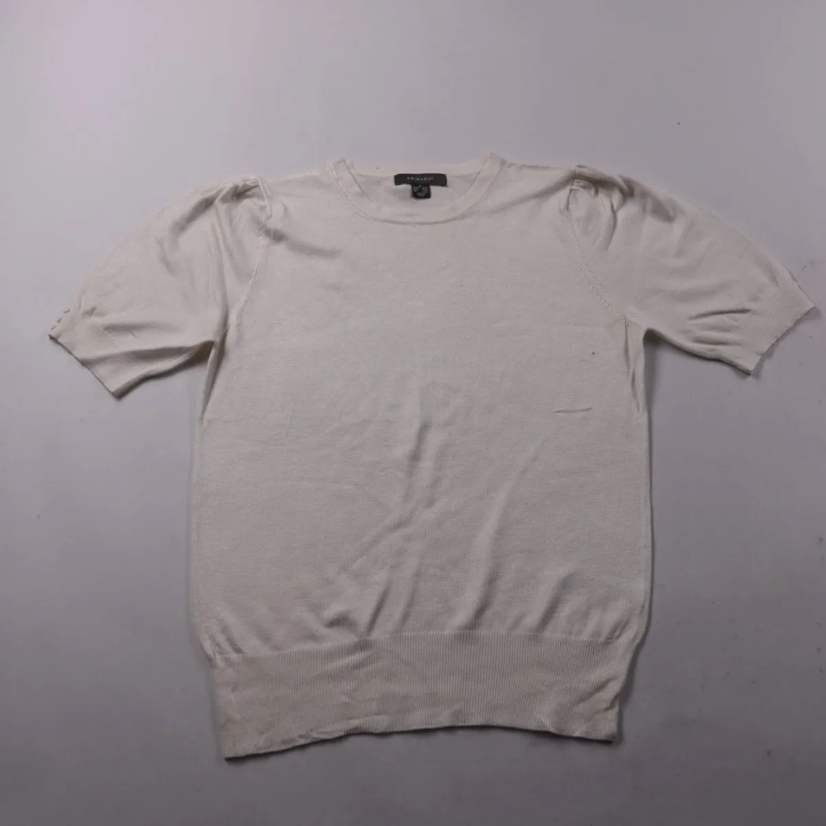 Женский трикотажный джемпер Primark молочного цвета с коротким рукавом и круглым вырезом. Подойдёт для повседневных образов и офиса в тёплое время или как слой под жакет. Мягкий материал и базовый цвет легко сочетаются с любыми брюками и юбками.