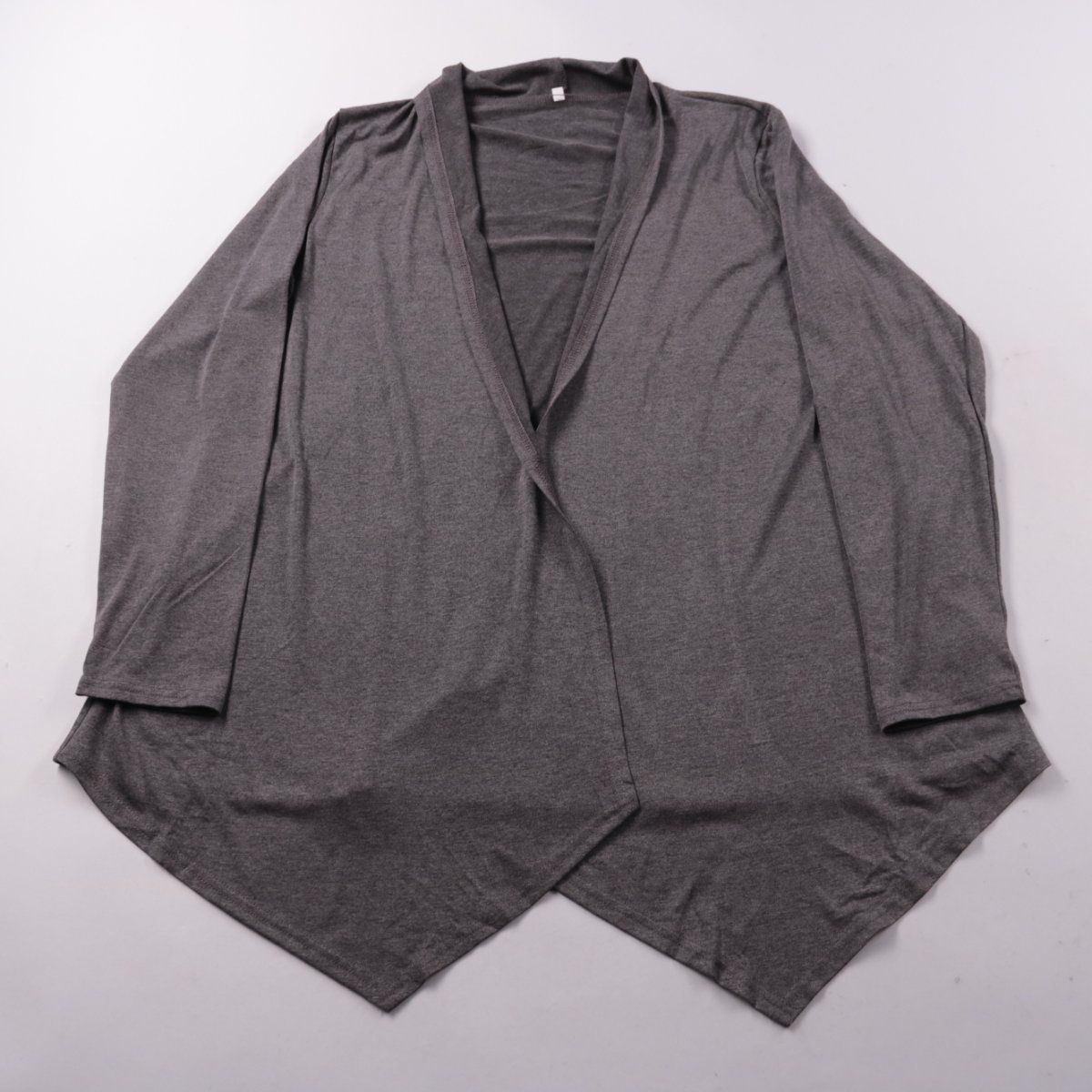 Женский кардиган без бренда из мягкого трикотажа с открытым передом и драпировкой. Подойдёт для повседневных образов и многослойных комплектов в прохладную погоду. Практичен тем, что лёгкий и не сковывает движения.