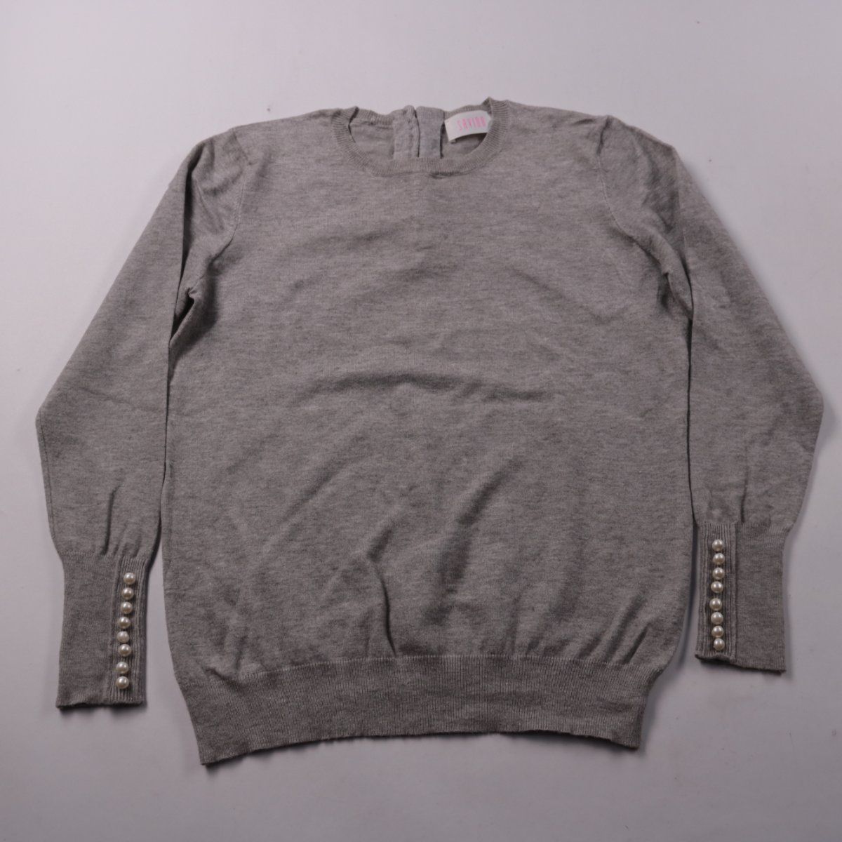 Серый джемпер Savida из мягкого трикотажа с декоративными жемчужными пуговицами на манжетах и на спинке. Подойдёт для повседневных образов, в офис или на прогулку в прохладную погоду. Практичный плюс — лёгкий в уходе материал на основе вискозы.