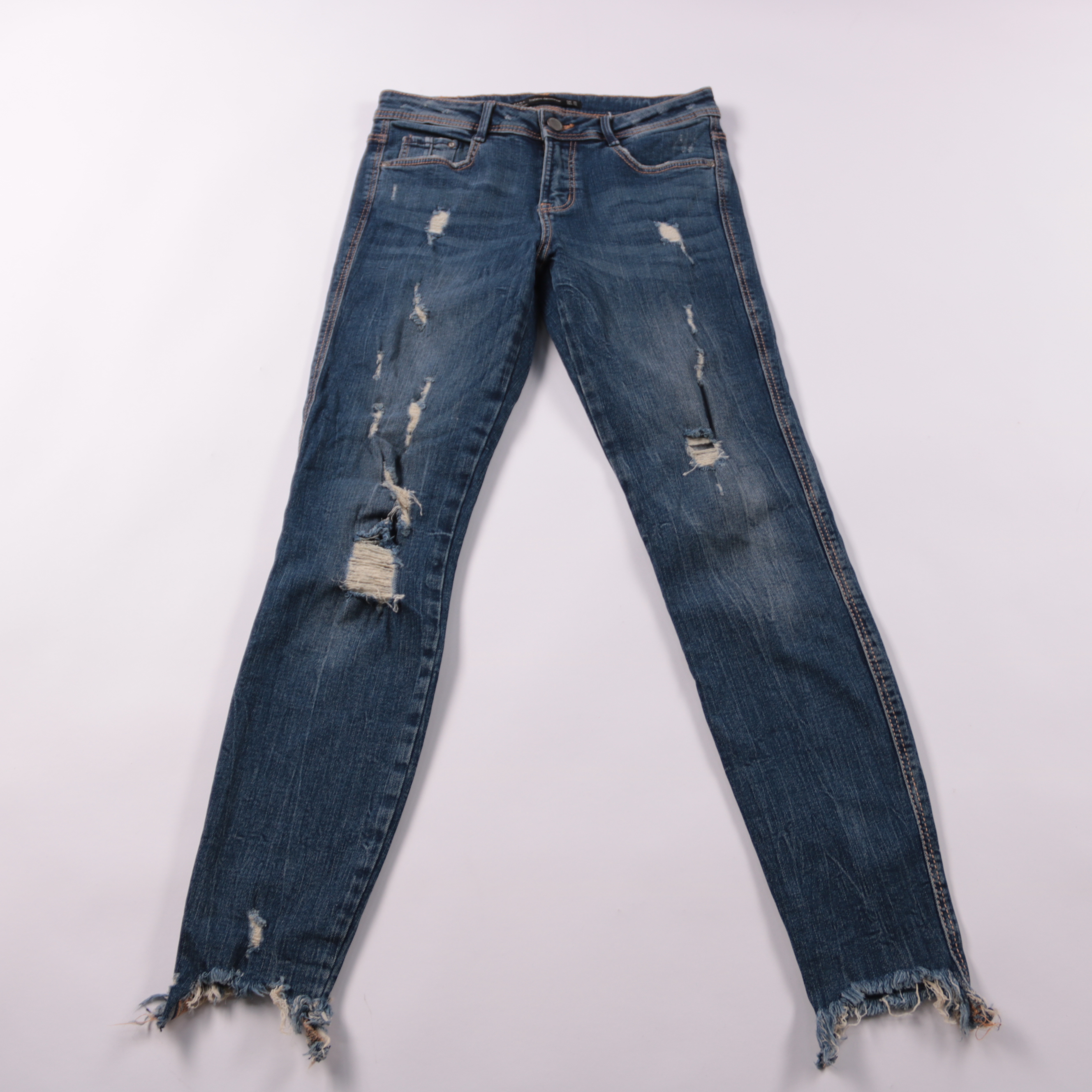 Женские джинсы Zara Trafaluc из синего денима с декоративными потертостями и необработанным краем по низу. Подойдут для повседневных образов с футболками, худи и жакетами в любой сезон. За счёт добавления эластана ткань немного тянется и комфортно сади...