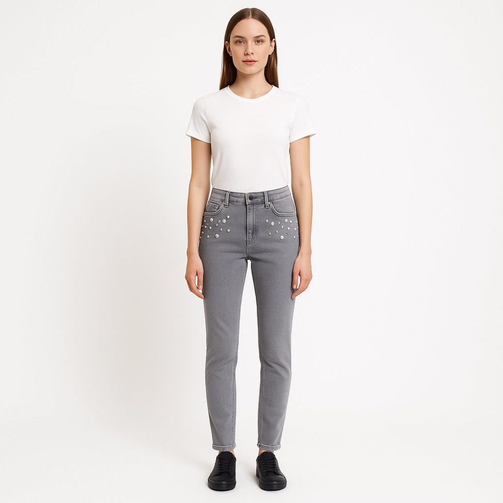 Женские серые джинсы Tu с высокой посадкой и декоративными заклёпками спереди. Подойдут для повседневных образов с футболками, свитерами и кедами в любое время года. Ткань с добавлением эластана хорошо тянется и комфортно садится по фигуре.